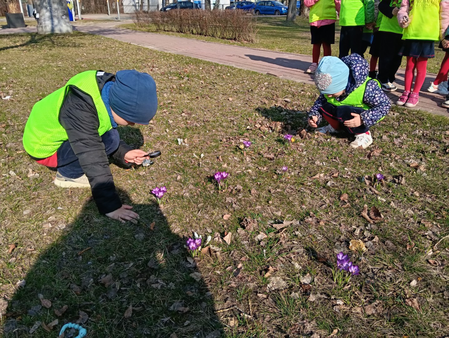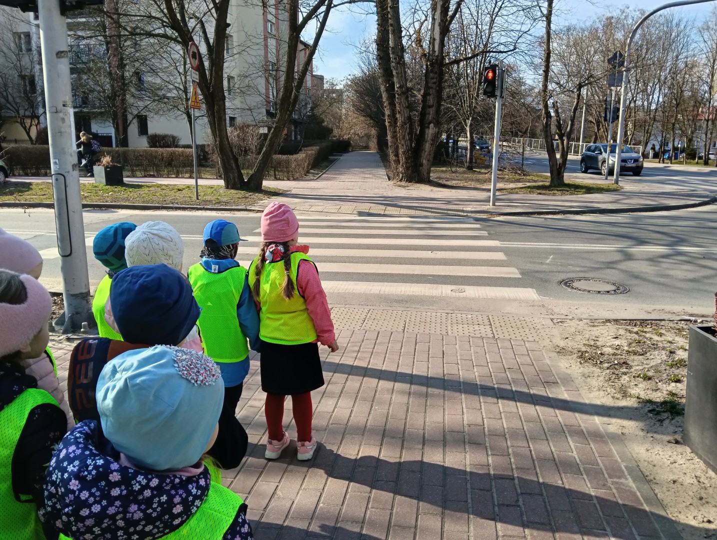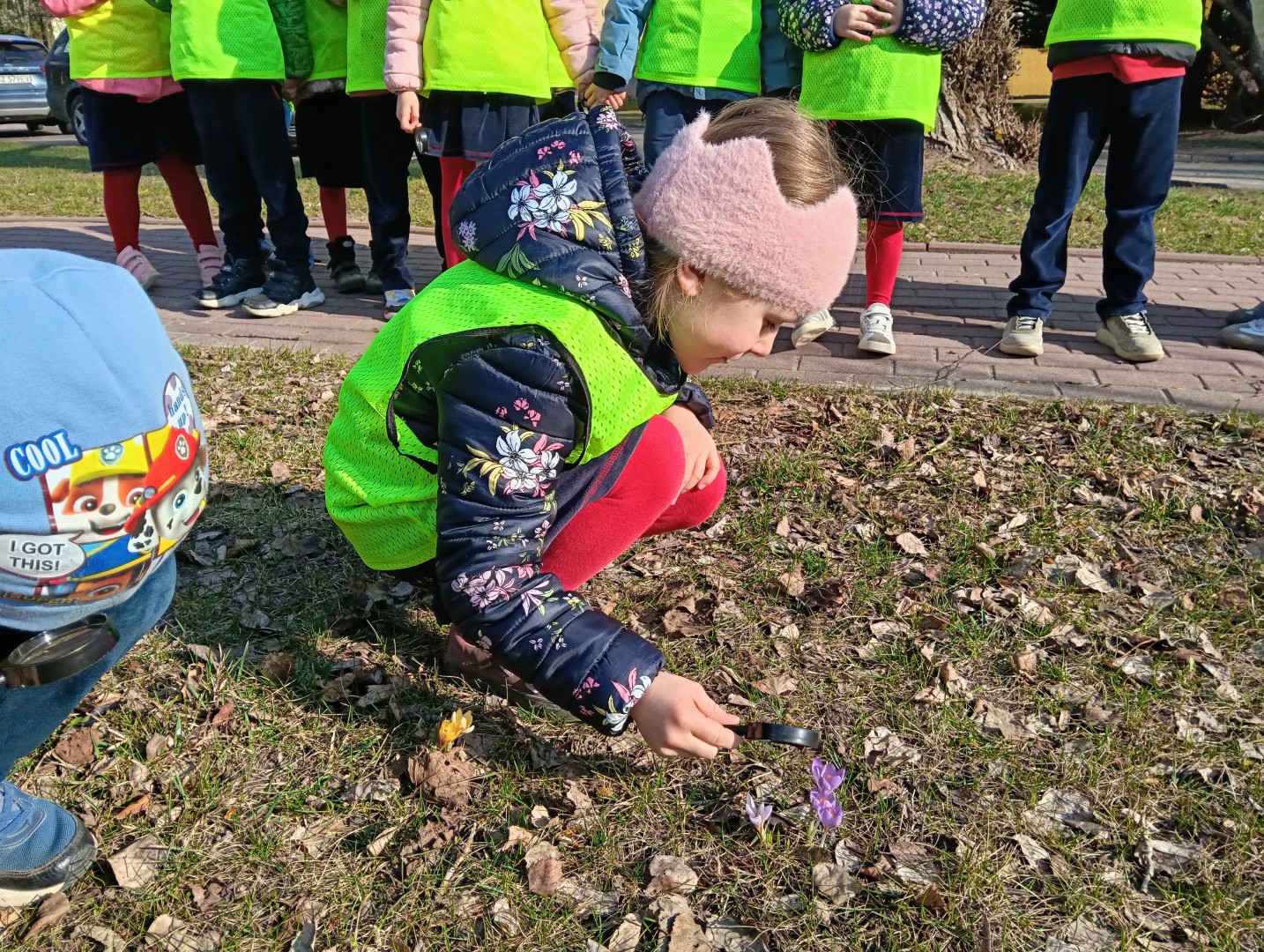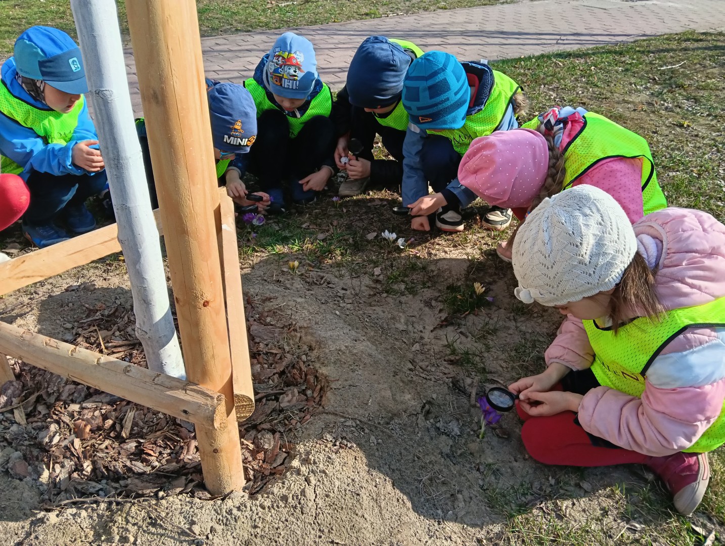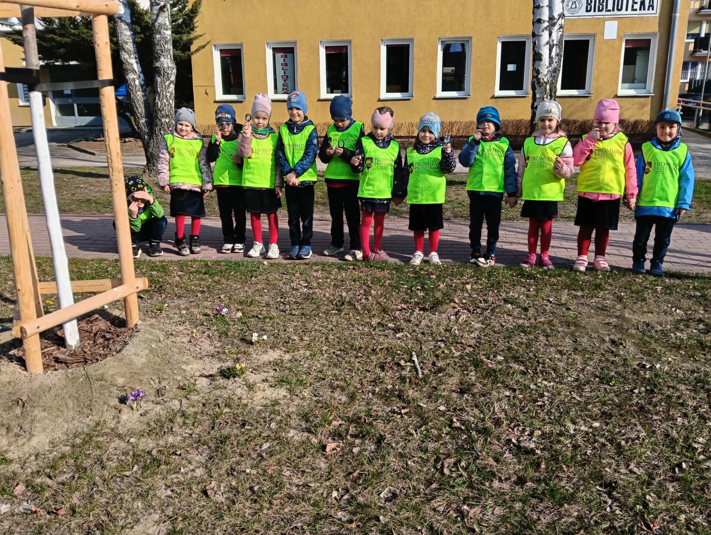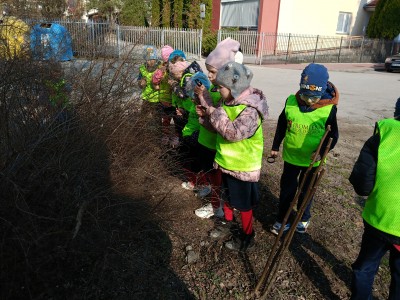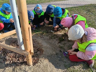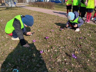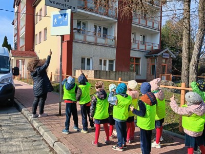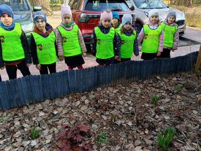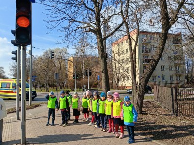 W ramach zajęć odbył się spacer, podczas którego dzieci miały na sobie kamizelki odblaskowe, dzięki czemu mogły w praktyce zastosować poznane zasady i zadbać o swoje bezpieczeństwo na drodze. Dodatkowo, podczas spaceru dzieci poszukiwały oznak wiosny, obserwując przyrodę przez lupy, co sprawiło im dużo radości i pozwoliło rozwijać ciekawość poznawczą.