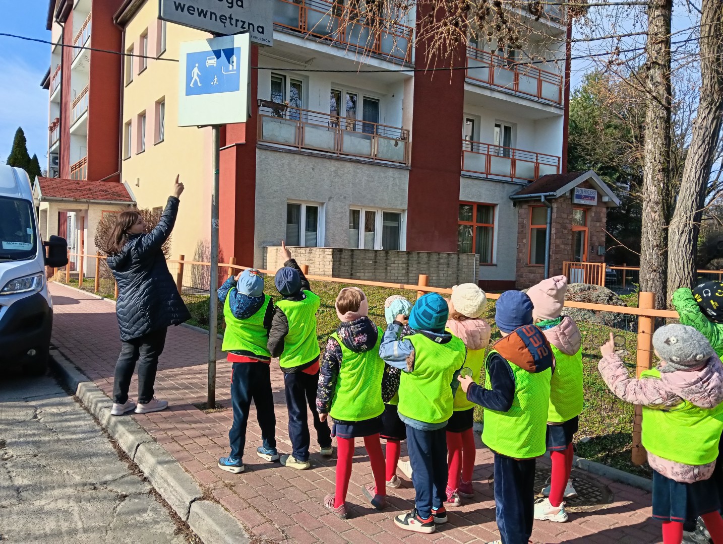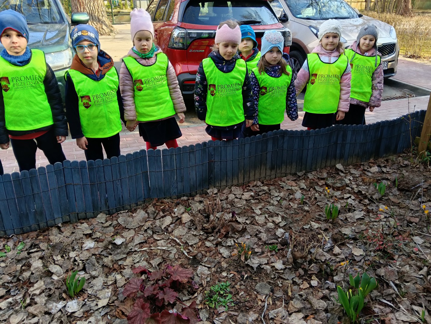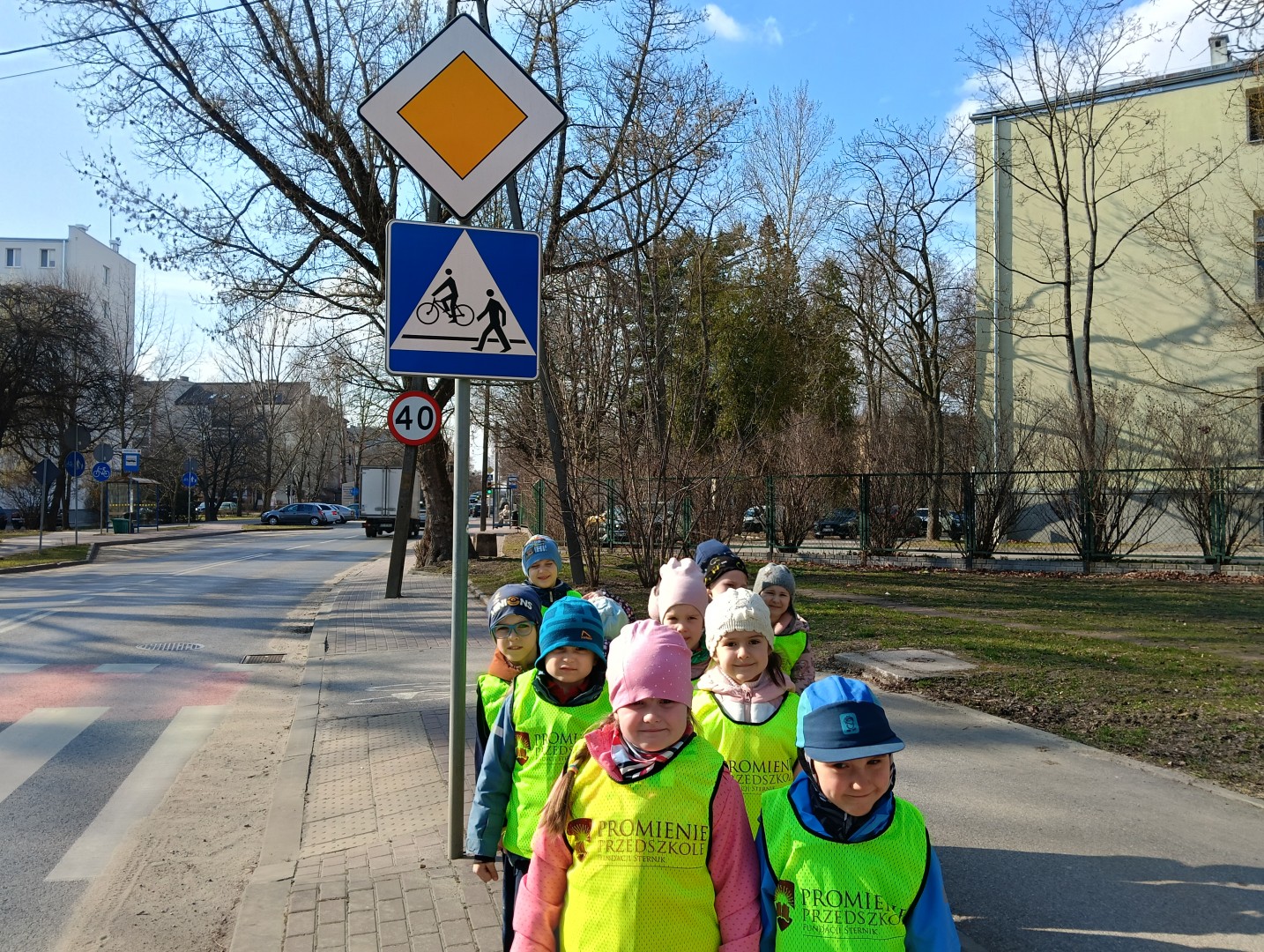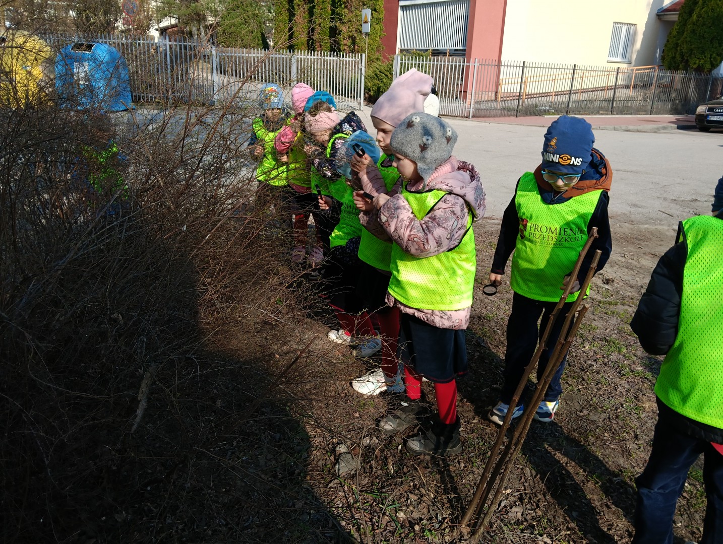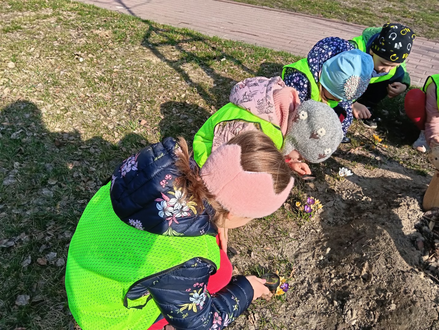 W ramach zajęć odbył się spacer, podczas którego dzieci miały na sobie kamizelki odblaskowe, dzięki czemu mogły w praktyce zastosować poznane zasady i zadbać o swoje bezpieczeństwo na drodze. Dodatkowo, podczas spaceru dzieci poszukiwały oznak wiosny, obserwując przyrodę przez lupy, co sprawiło im dużo radości i pozwoliło rozwijać ciekawość poznawczą.
