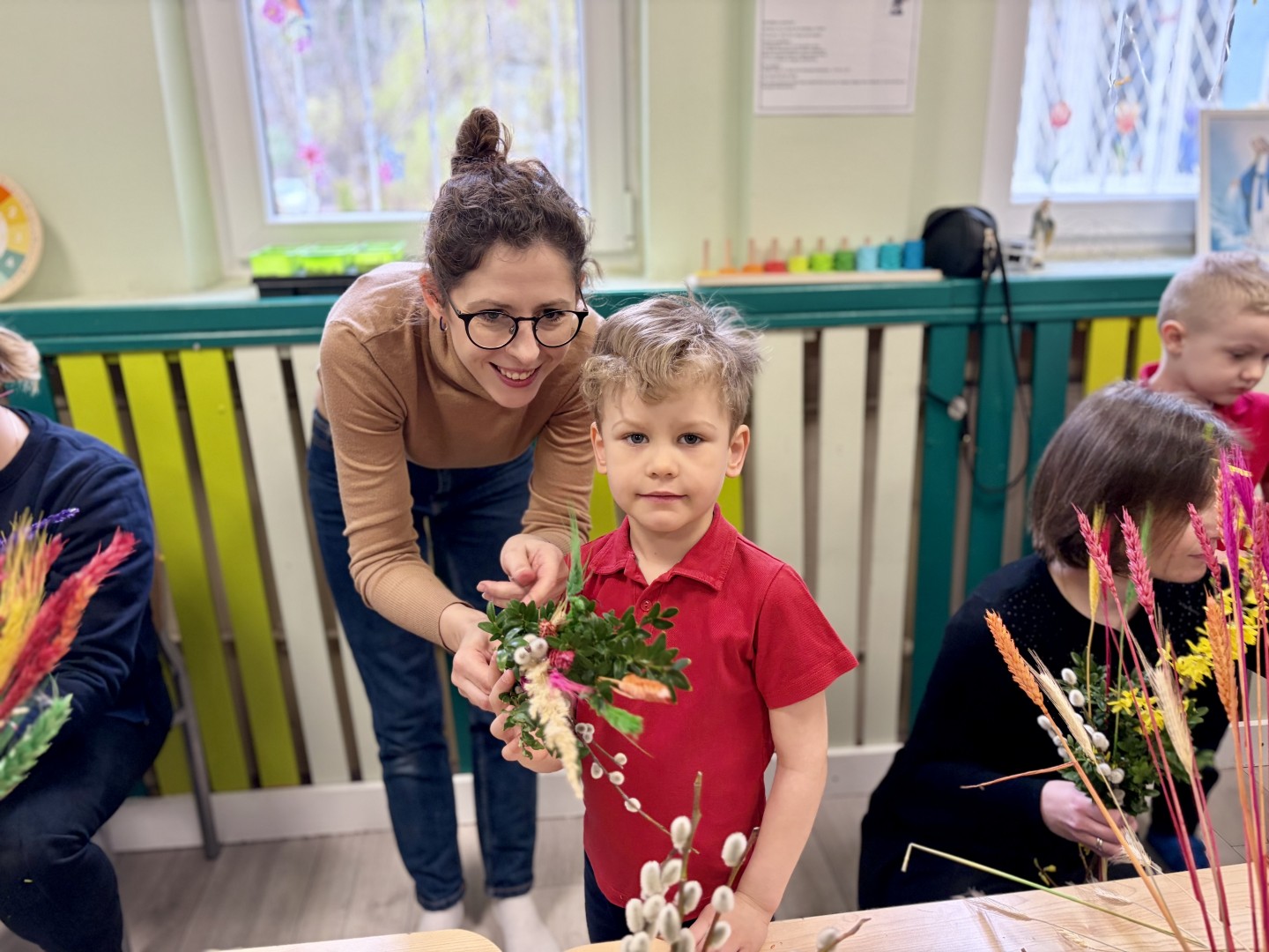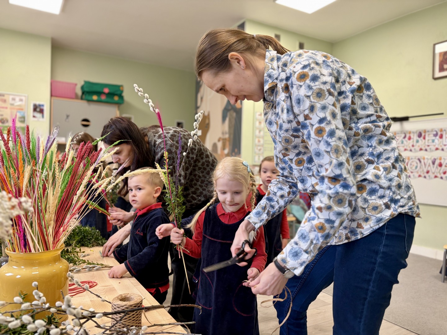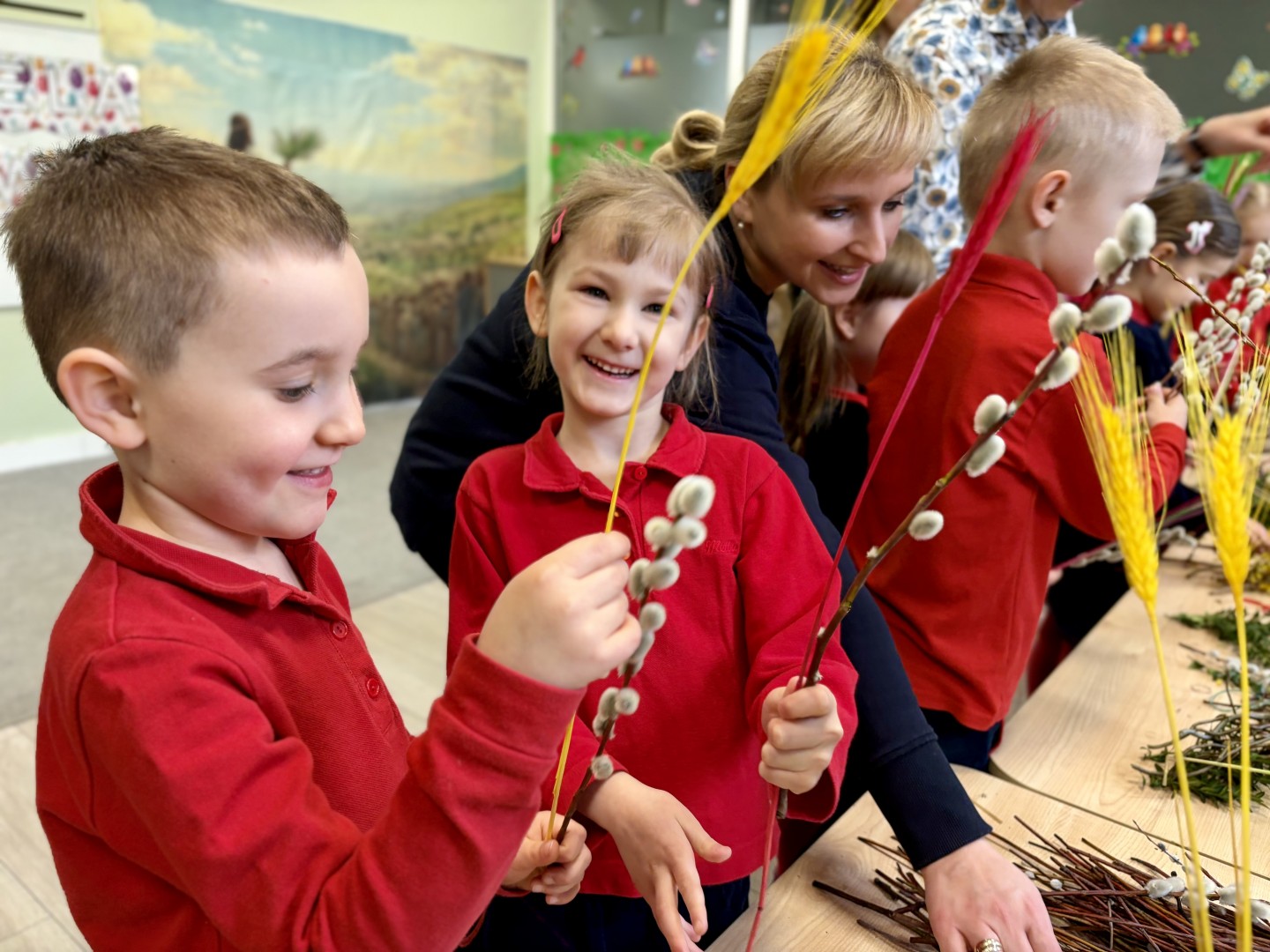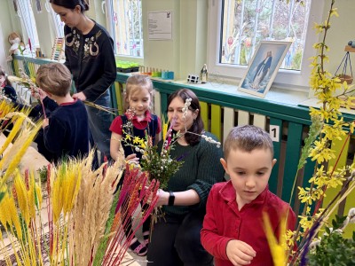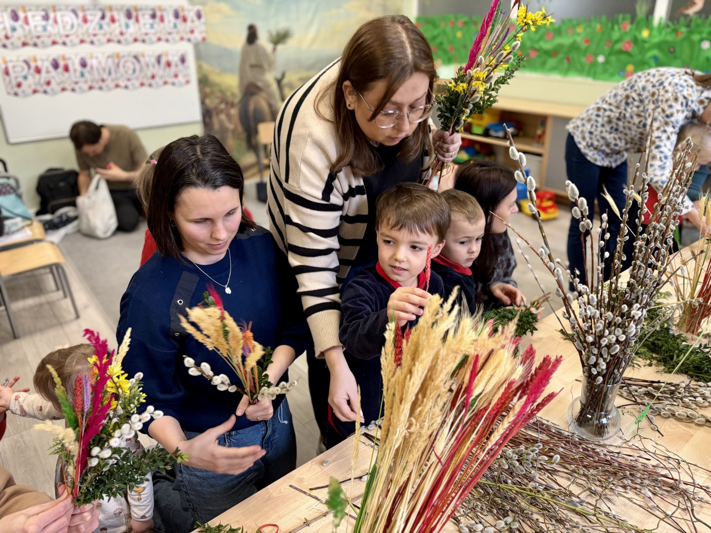 Dzieci z wielkim zaangażowaniem łączyły gałązki bukszpanu z baziami, dodawały kolorowe kłosy zbóż. Każda palma była niepowtarzalna i odzwierciedlała kreatywność oraz radość płynącą ze wspólnego tworzenia.