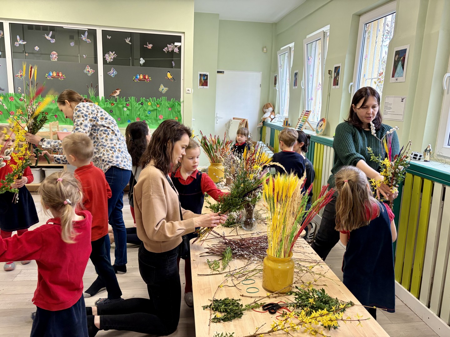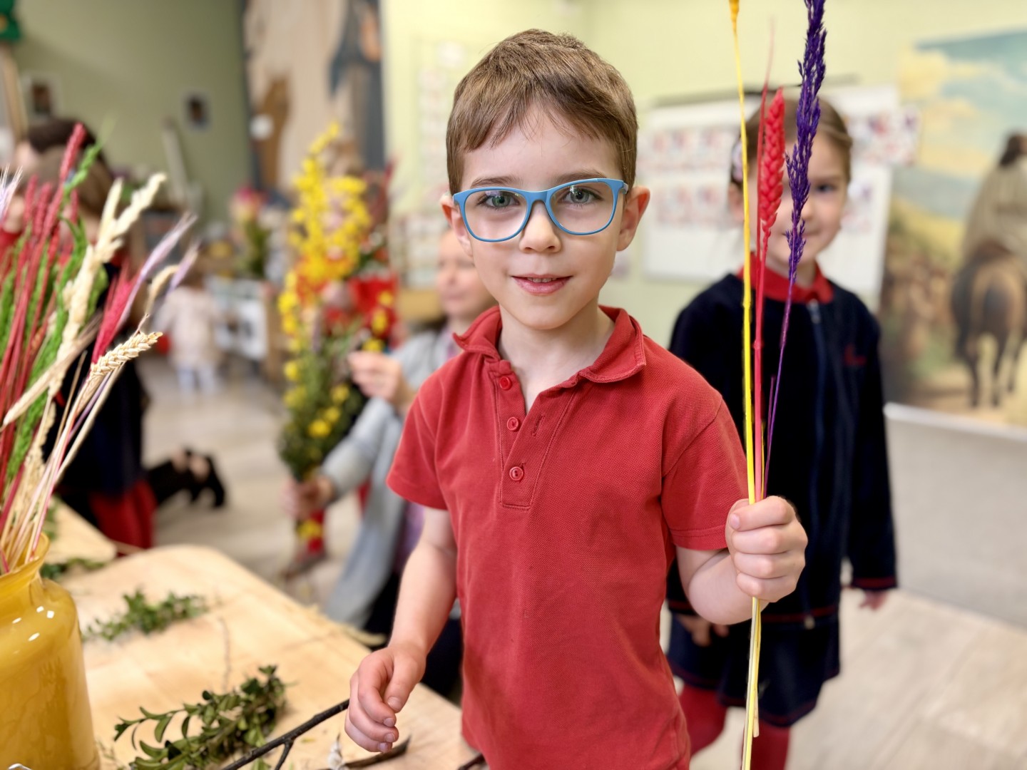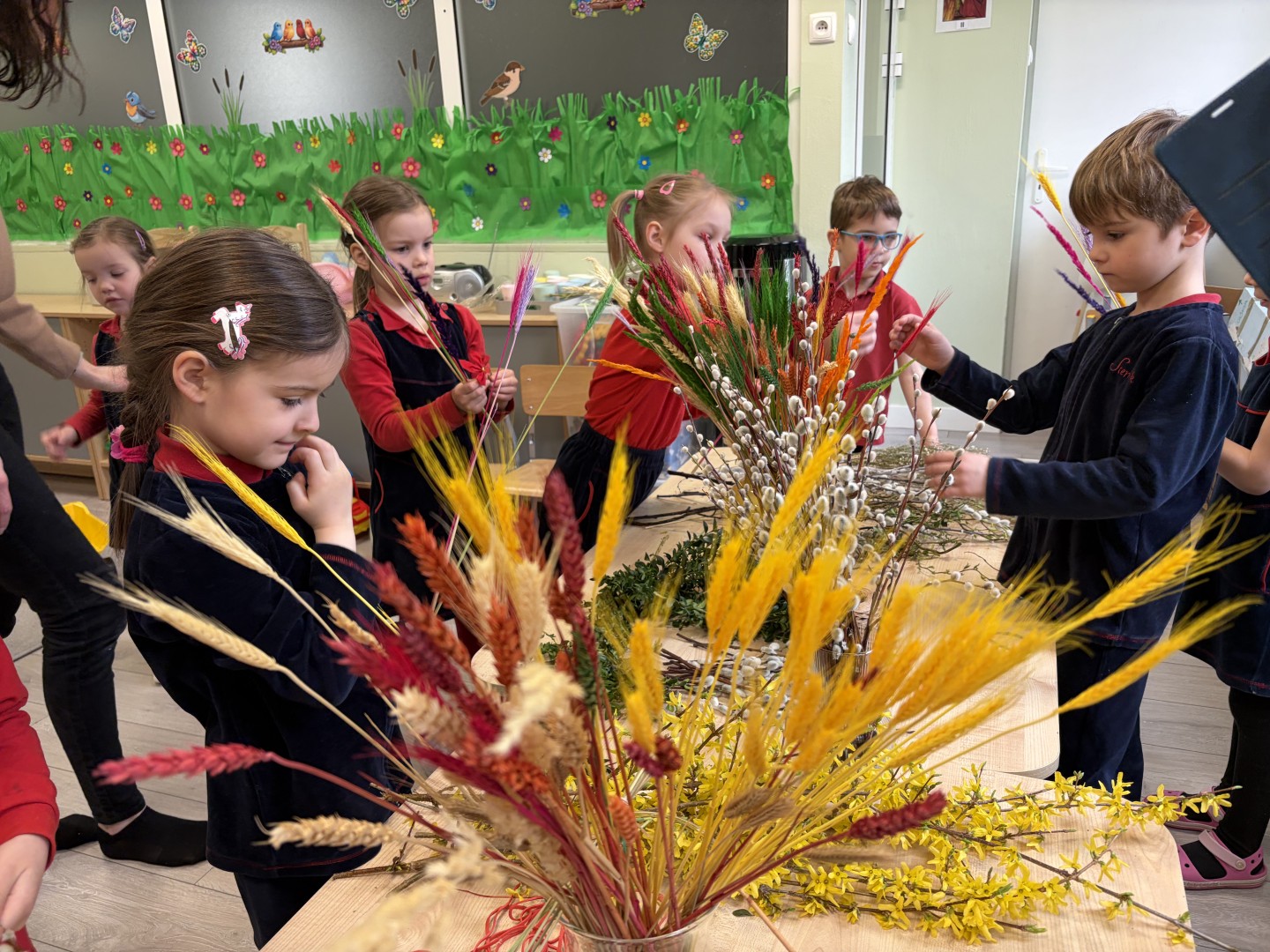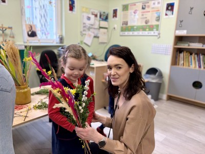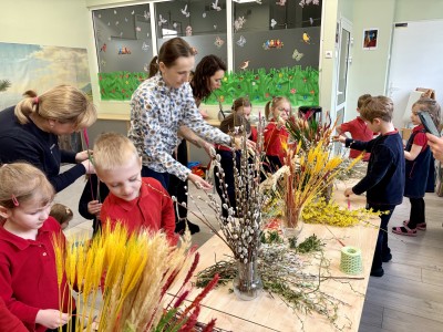 Dzieci z wielkim zaangażowaniem łączyły gałązki bukszpanu z baziami, dodawały kolorowe kłosy zbóż. Każda palma była niepowtarzalna i odzwierciedlała kreatywność oraz radość płynącą ze wspólnego tworzenia.