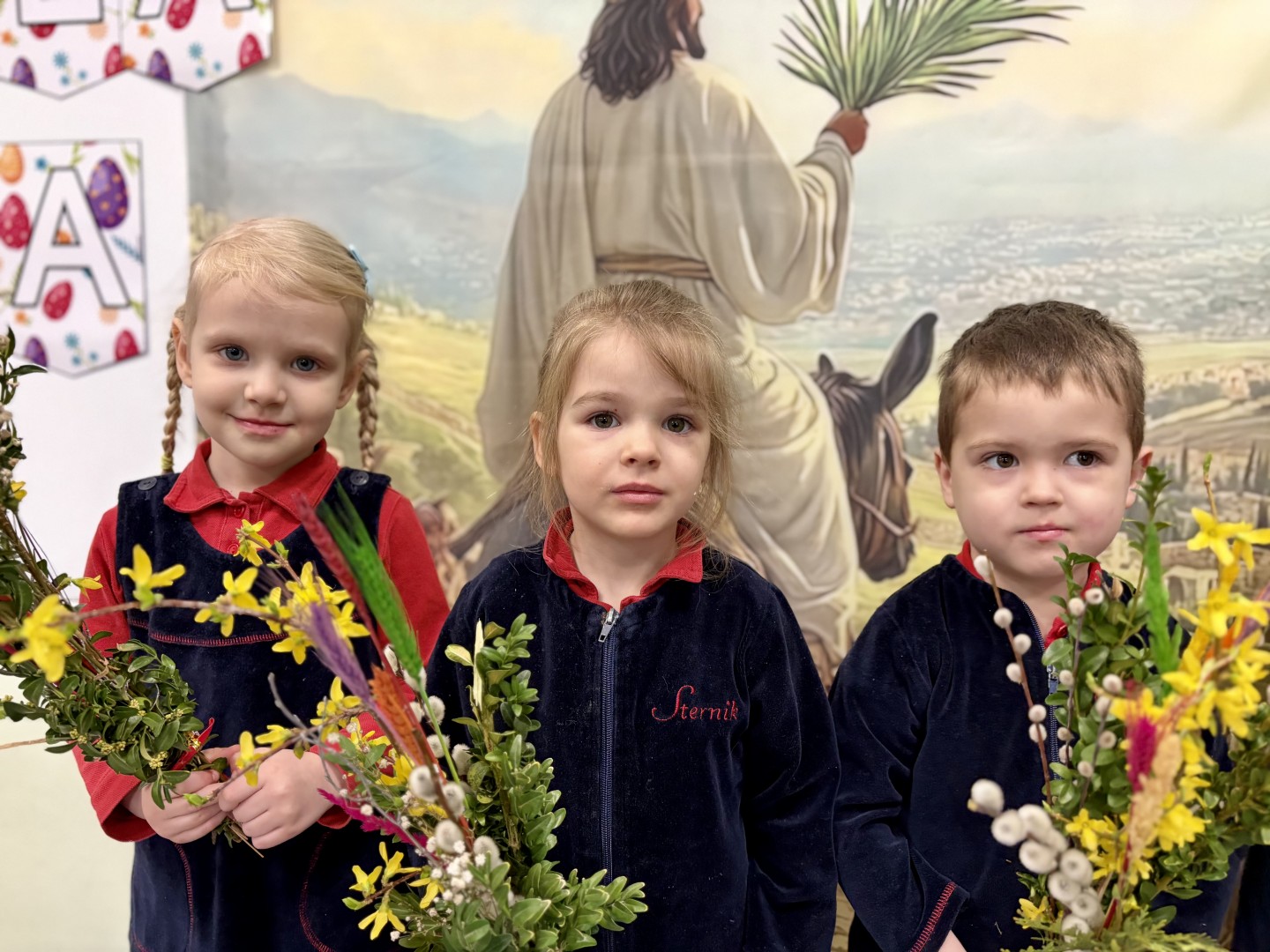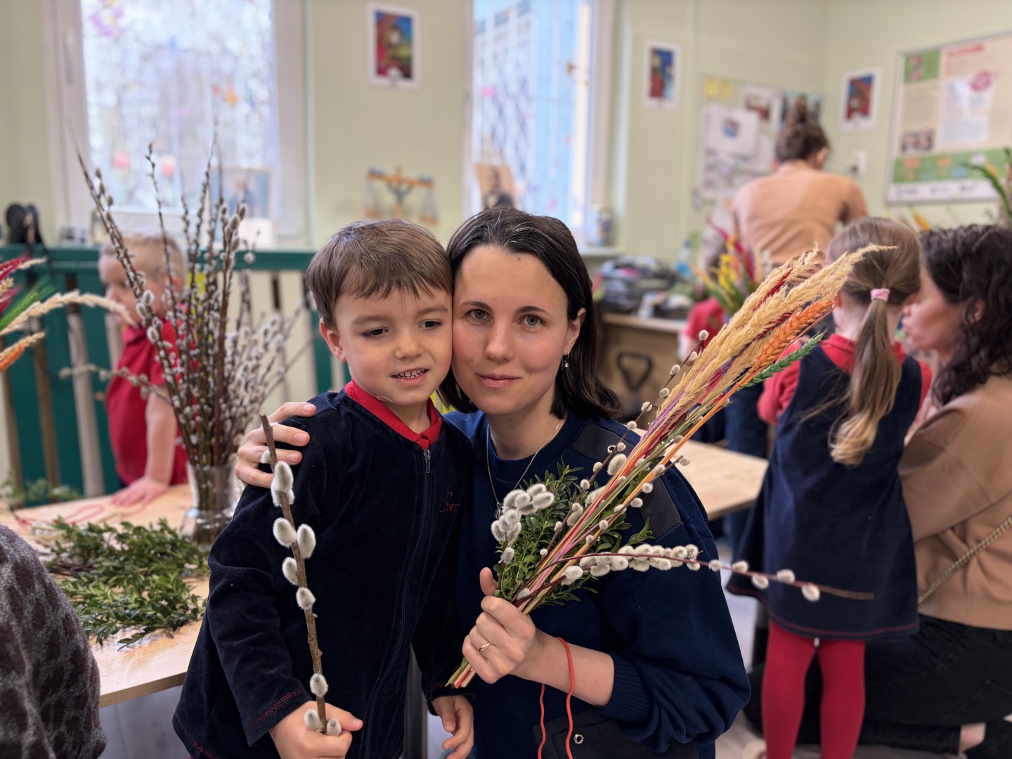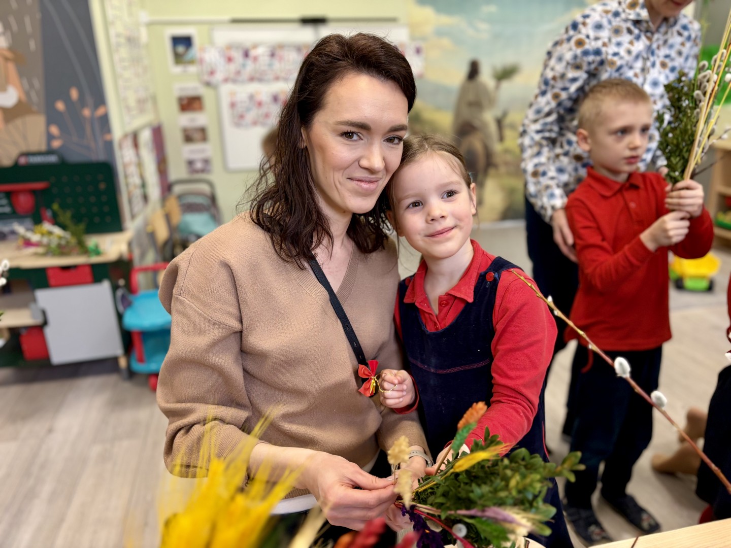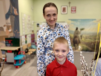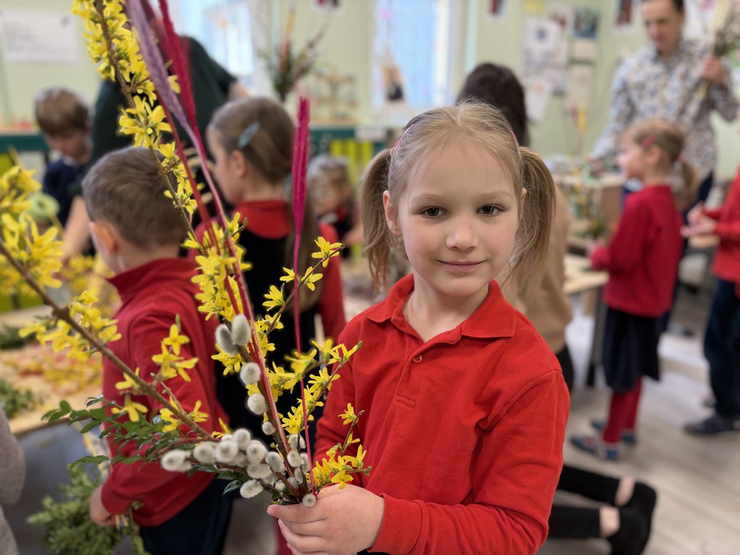 Dzieci z wielkim zaangażowaniem łączyły gałązki bukszpanu z baziami, dodawały kolorowe kłosy zbóż. Każda palma była niepowtarzalna i odzwierciedlała kreatywność oraz radość płynącą ze wspólnego tworzenia.