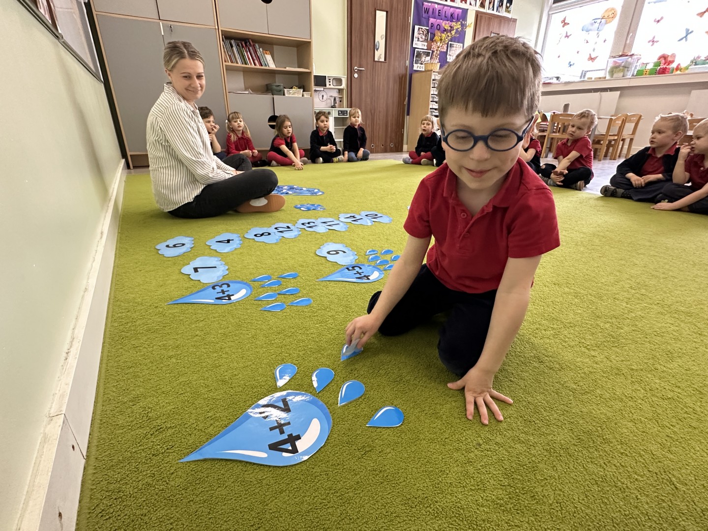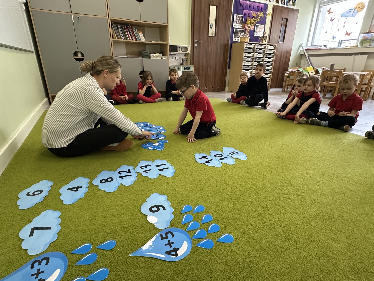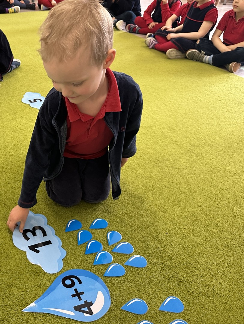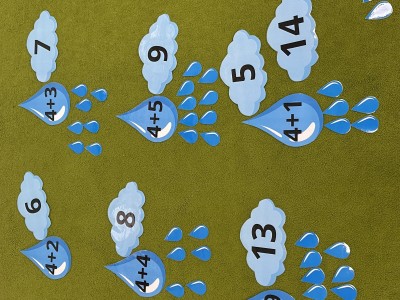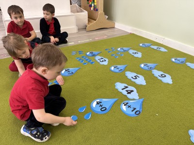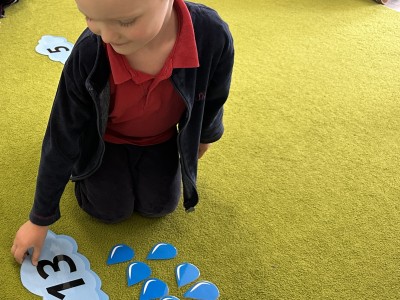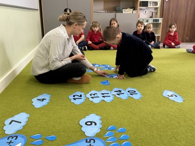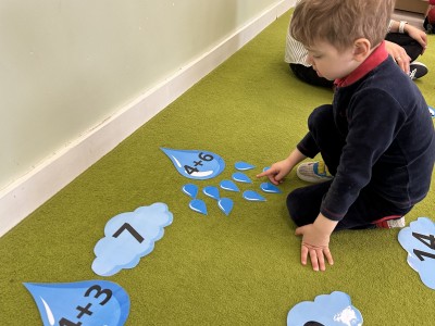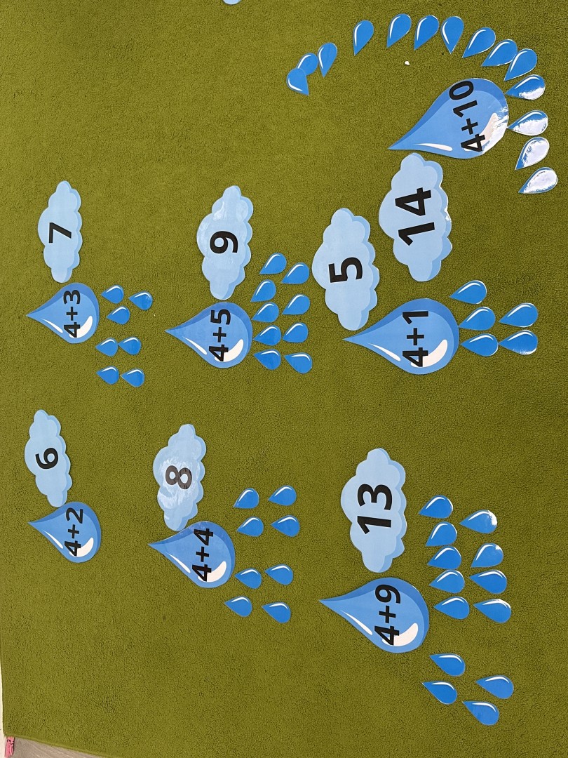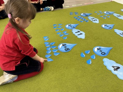 Dzieci wykonywały różnorodne zadania. Na dużych kropelkach znajdowały się działania matematyczne z dodawaniem, natomiast na małych kropelkach dzieci przeliczały elementy. Następnie ich zadaniem było dopasowanie wyniku z odpowiednią chmurką.