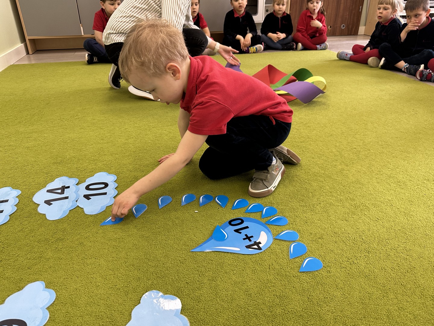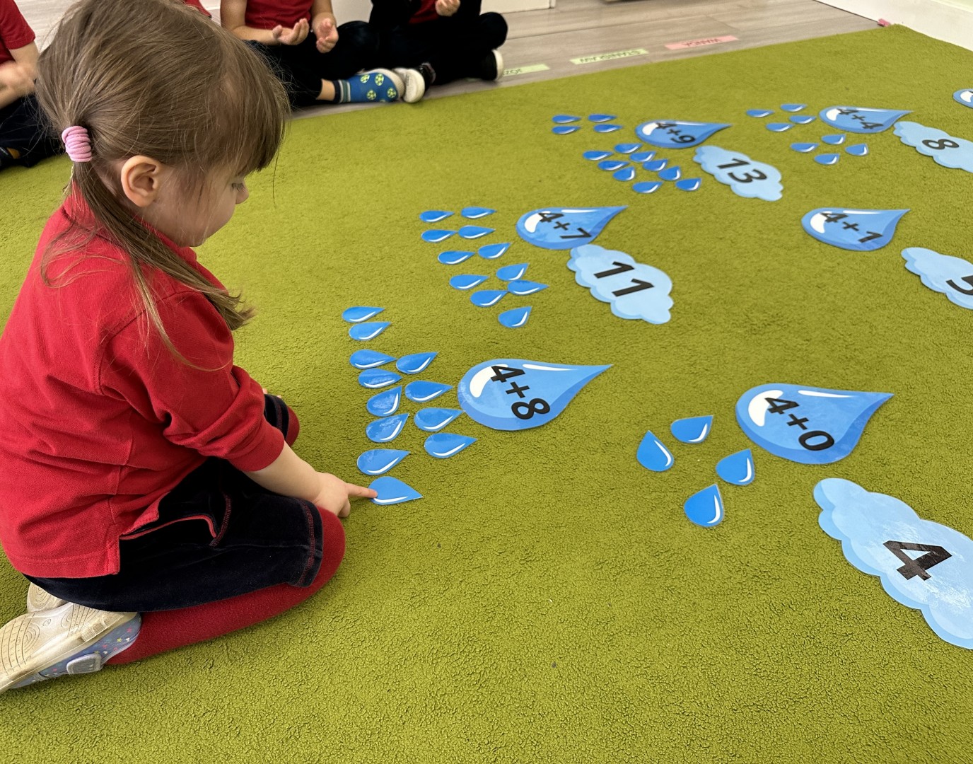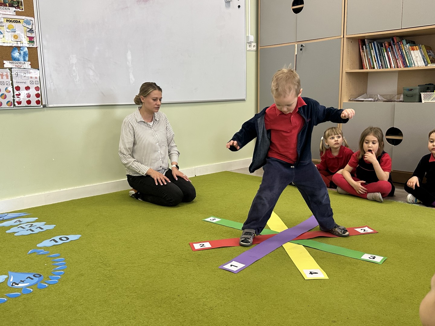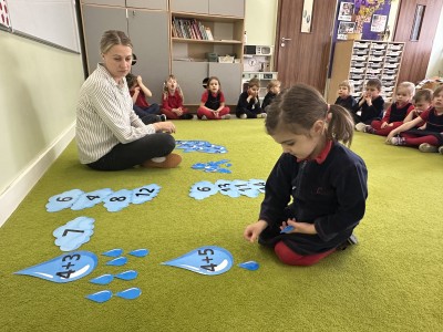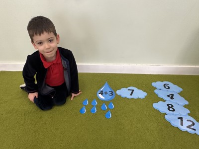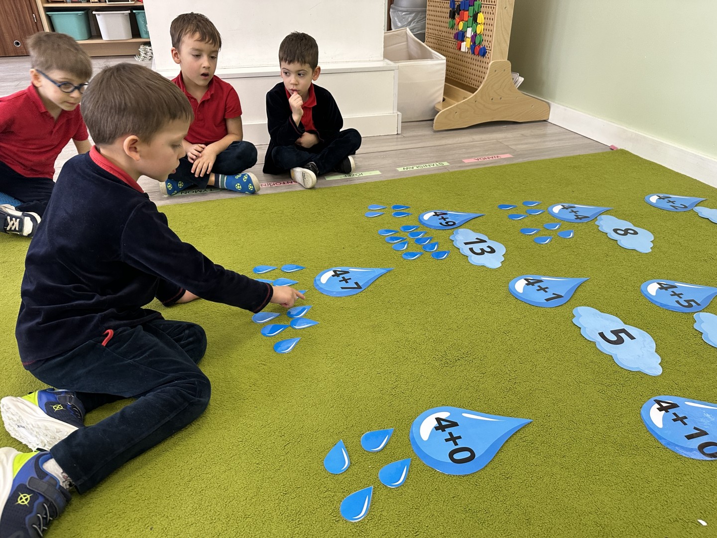 Dzieci wykonywały różnorodne zadania. Na dużych kropelkach znajdowały się działania matematyczne z dodawaniem, natomiast na małych kropelkach dzieci przeliczały elementy. Następnie ich zadaniem było dopasowanie wyniku z odpowiednią chmurką.