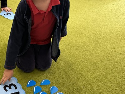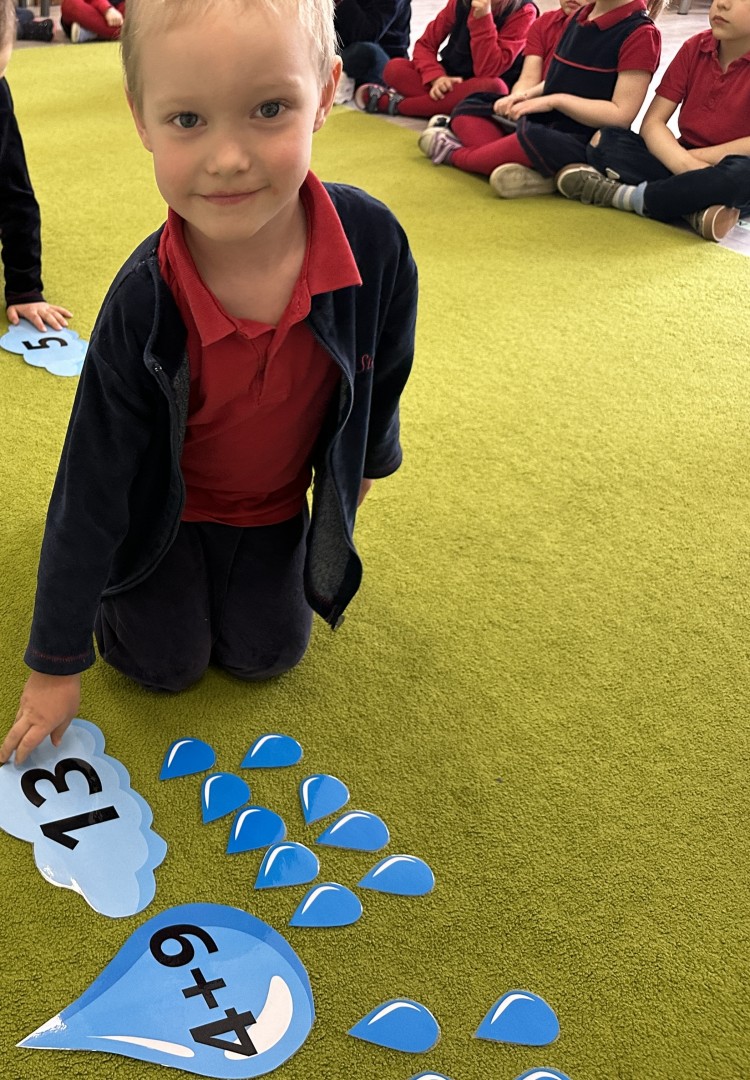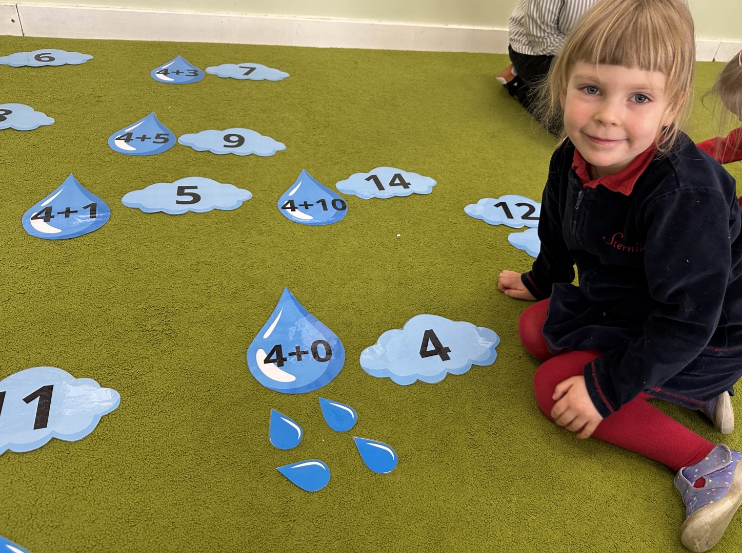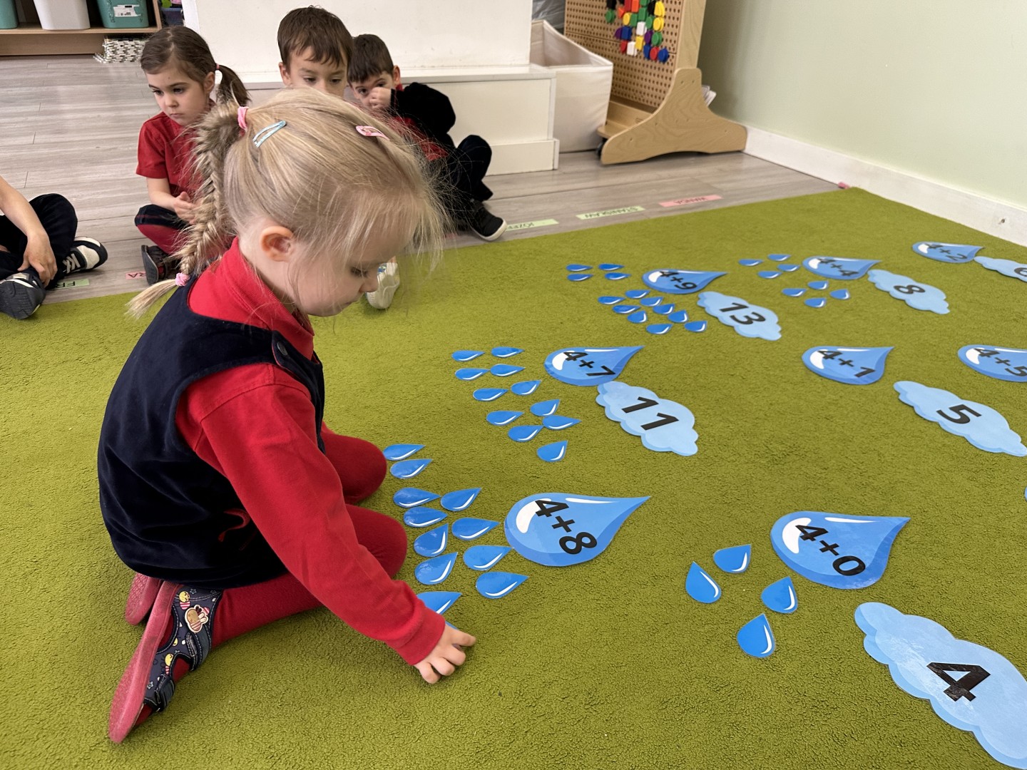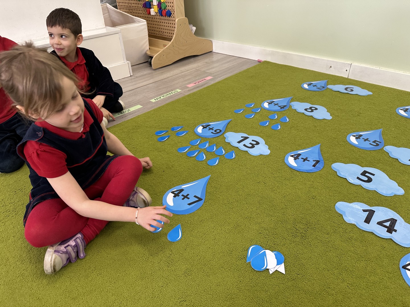 Dzieci wykonywały różnorodne zadania. Na dużych kropelkach znajdowały się działania matematyczne z dodawaniem, natomiast na małych kropelkach dzieci przeliczały elementy. Następnie ich zadaniem było dopasowanie wyniku z odpowiednią chmurką.
