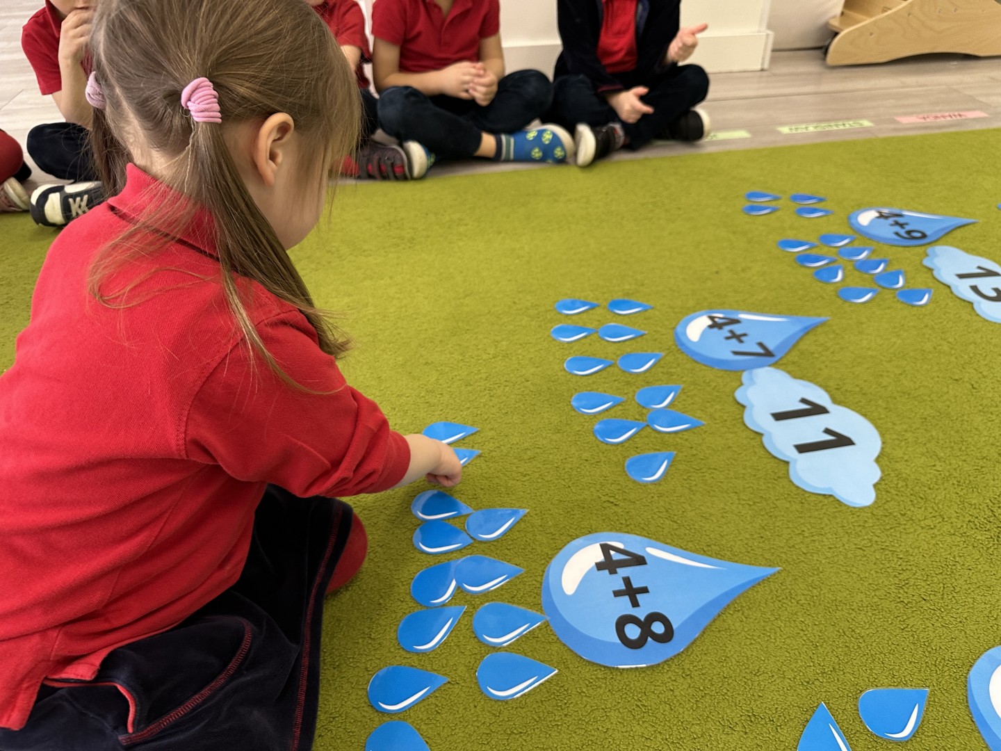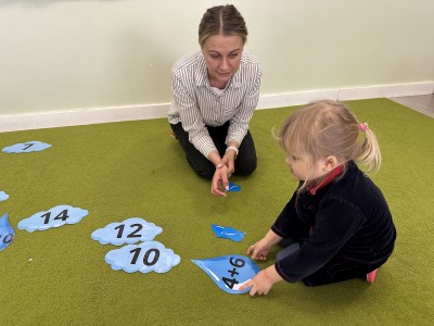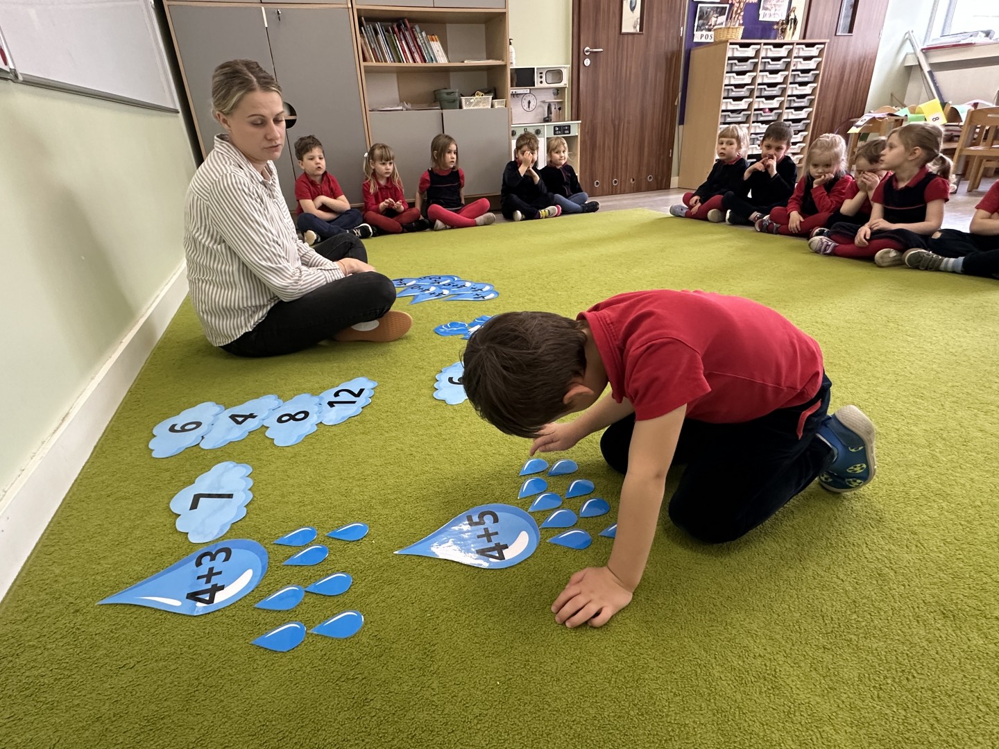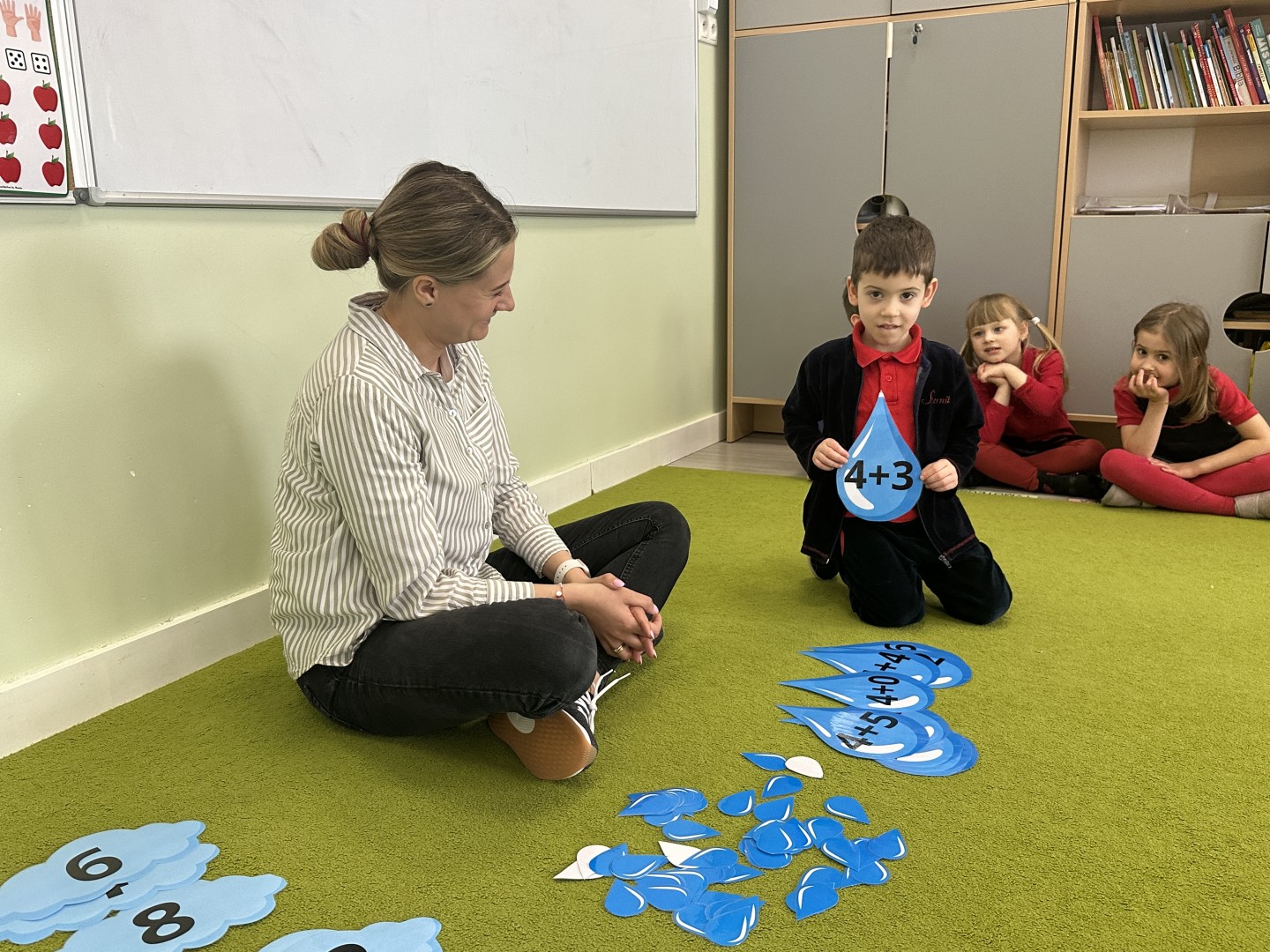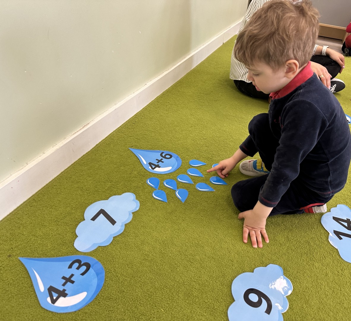 Dzieci wykonywały różnorodne zadania. Na dużych kropelkach znajdowały się działania matematyczne z dodawaniem, natomiast na małych kropelkach dzieci przeliczały elementy. Następnie ich zadaniem było dopasowanie wyniku z odpowiednią chmurką.