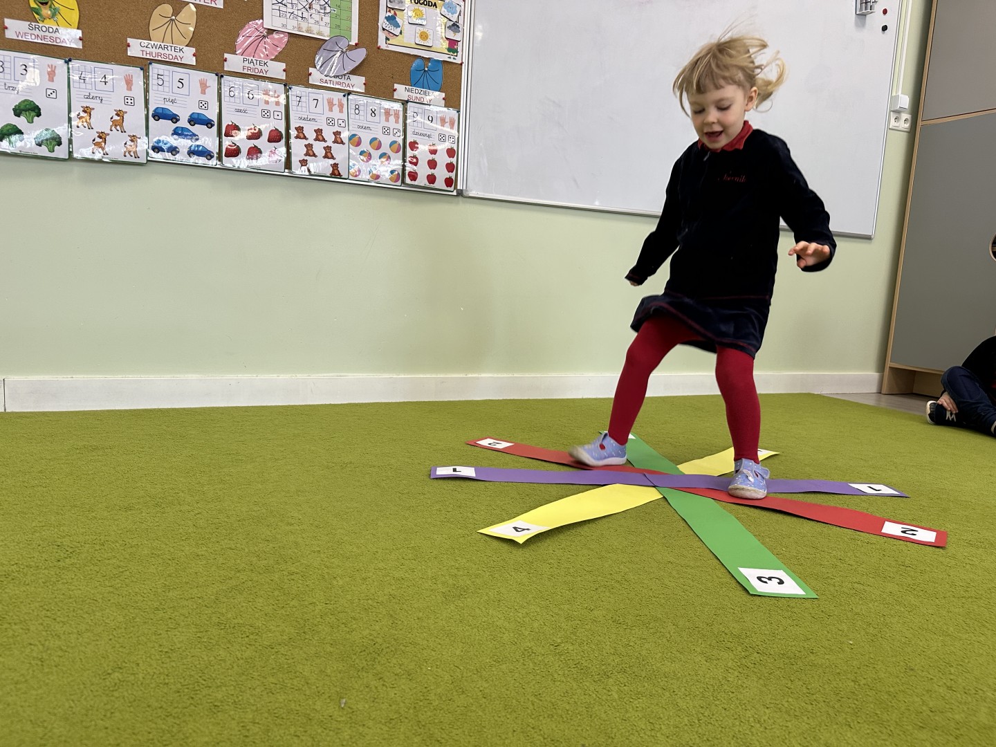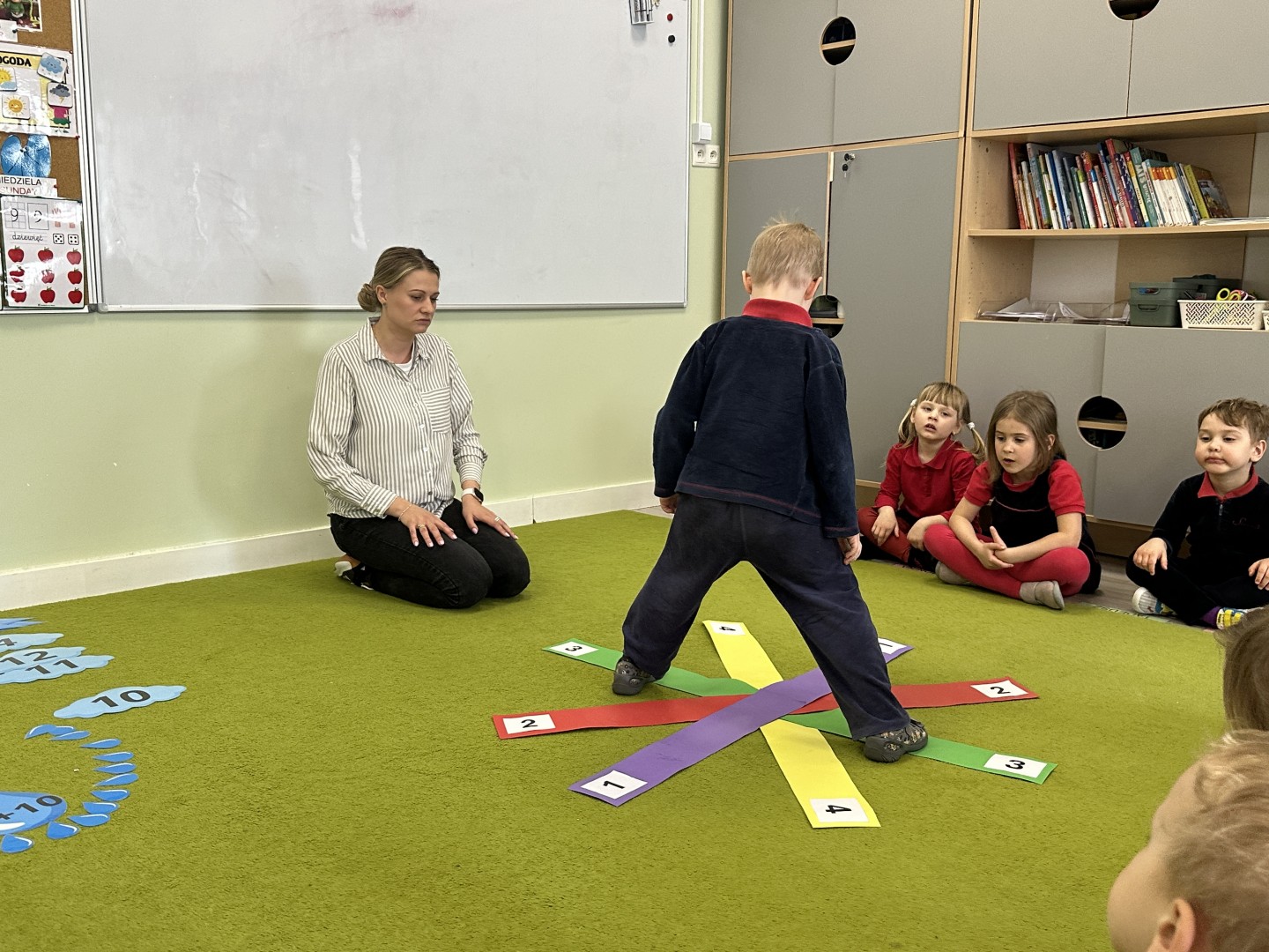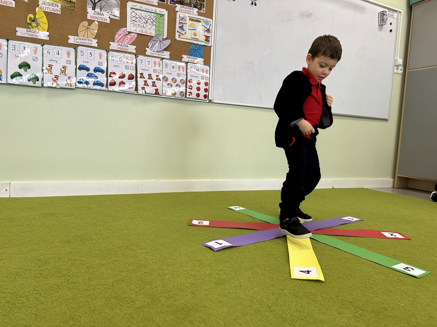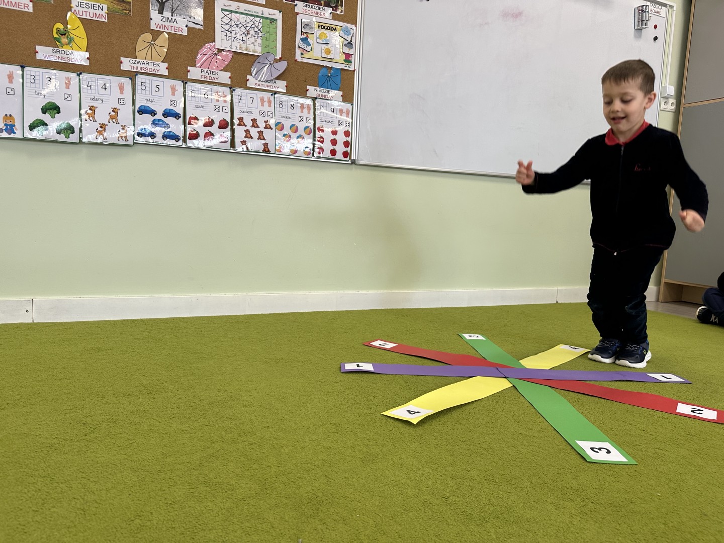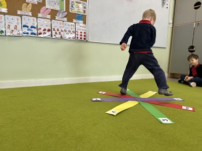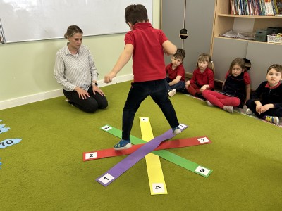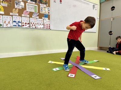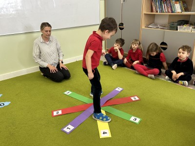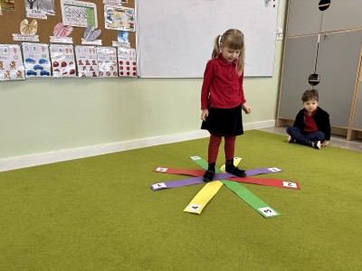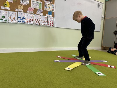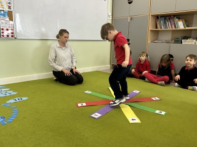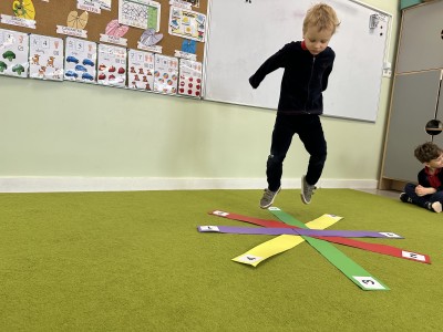 W trakcie zajęć nie zabrakło również aktywności ruchowych – dzieci brały udział w zabawie, w której nauczyciel podawał cyfrę, a ich zadaniem było odszukanie jej i skoczenie na właściwe pole.