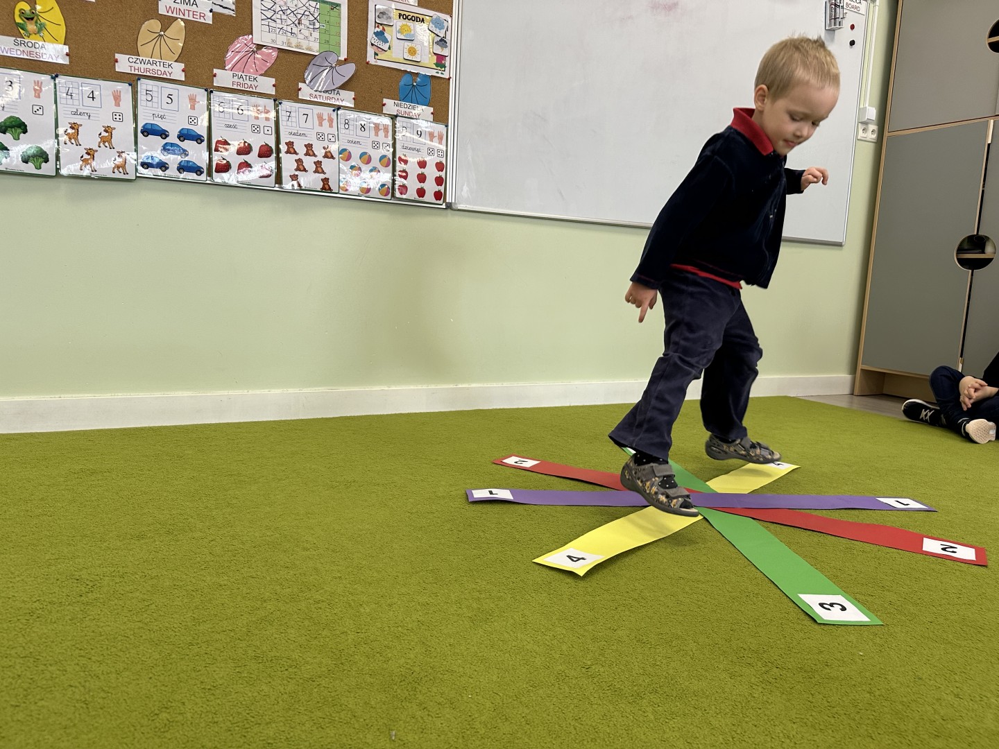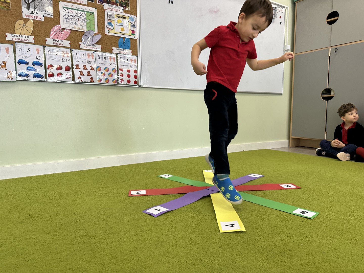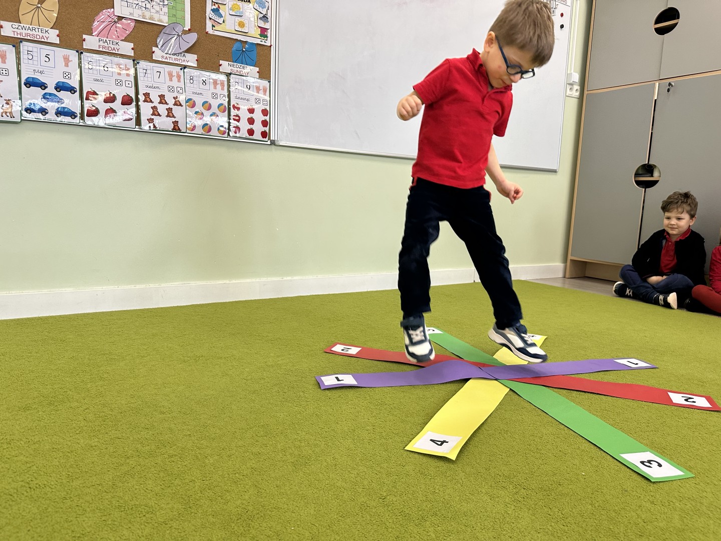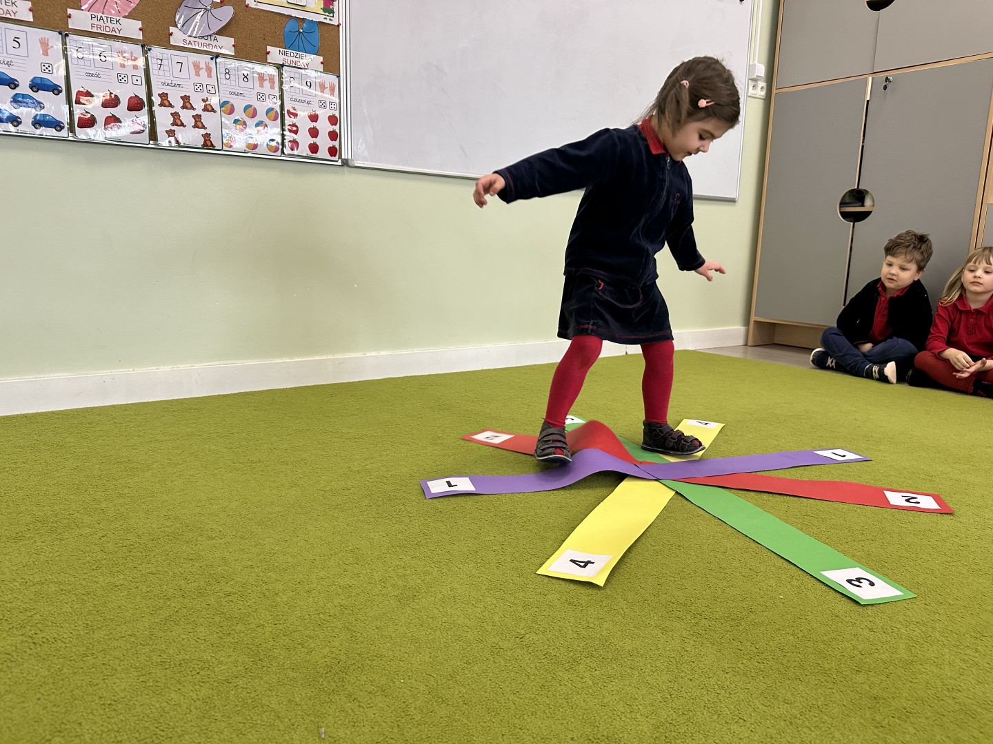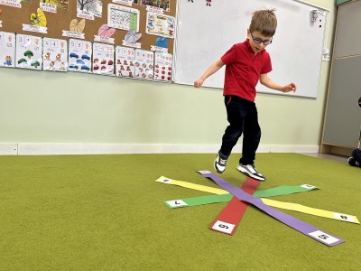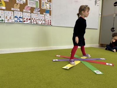 W trakcie zajęć nie zabrakło również aktywności ruchowych – dzieci brały udział w zabawie, w której nauczyciel podawał cyfrę, a ich zadaniem było odszukanie jej i skoczenie na właściwe pole.