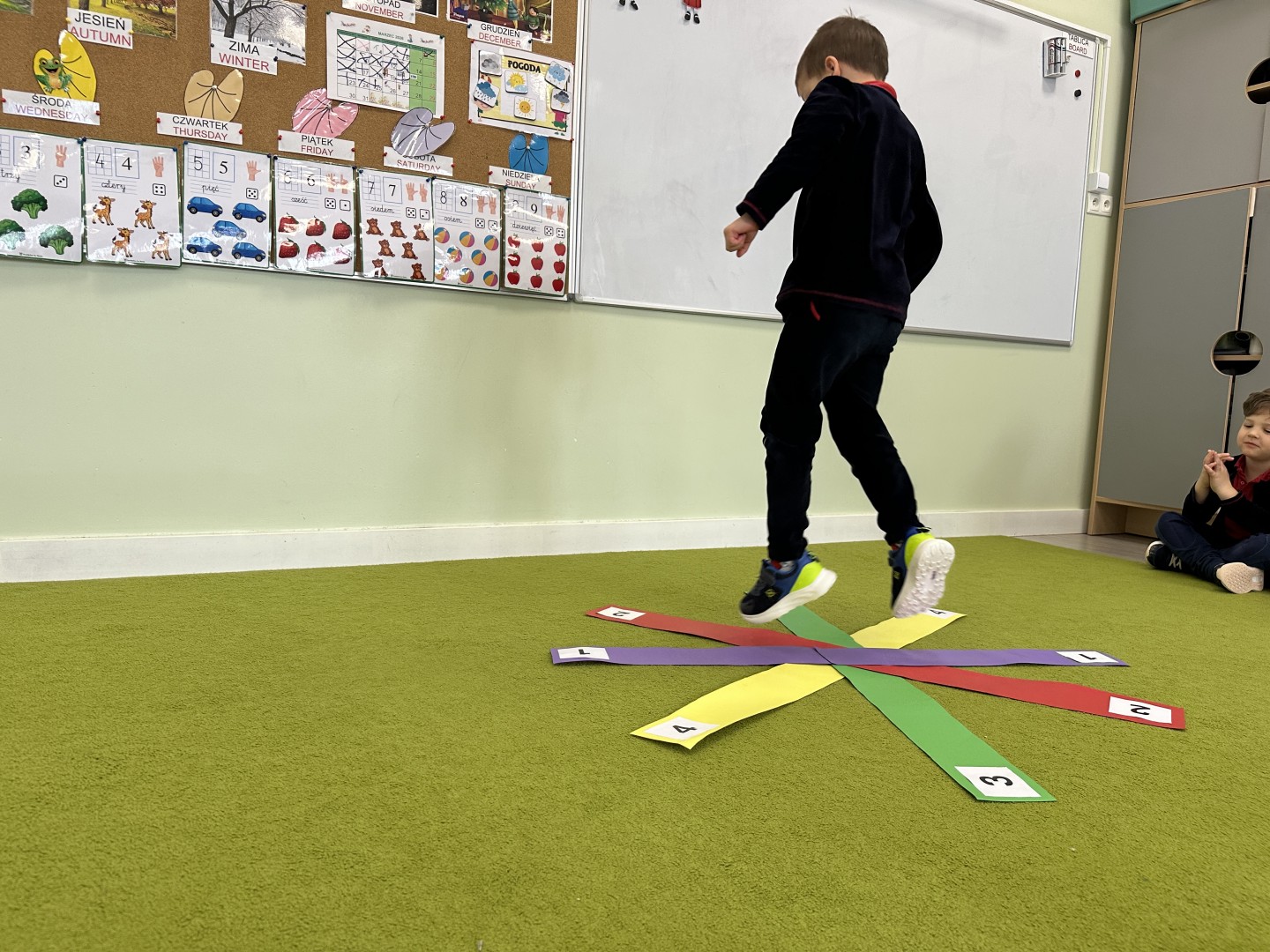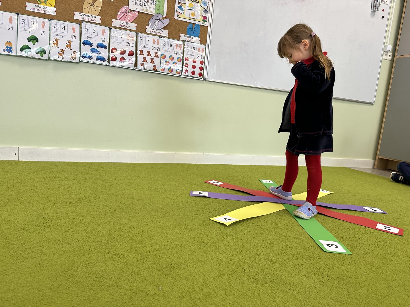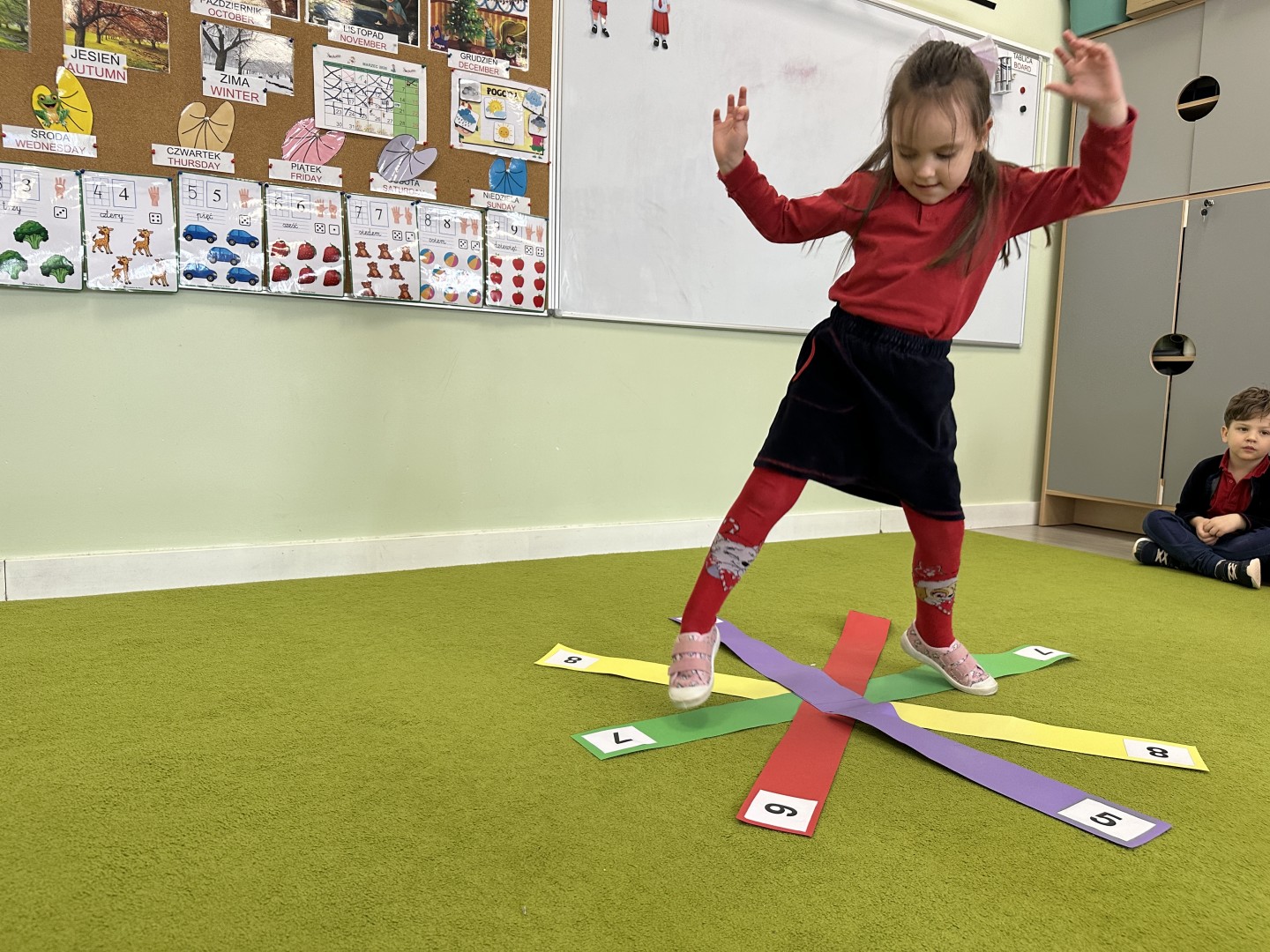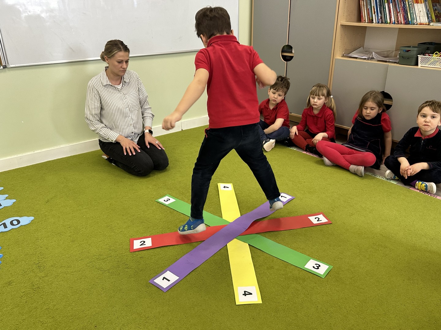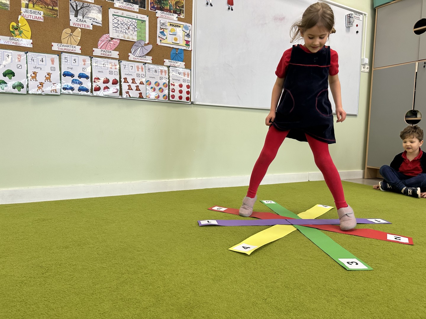 W trakcie zajęć nie zabrakło również aktywności ruchowych – dzieci brały udział w zabawie, w której nauczyciel podawał cyfrę, a ich zadaniem było odszukanie jej i skoczenie na właściwe pole.