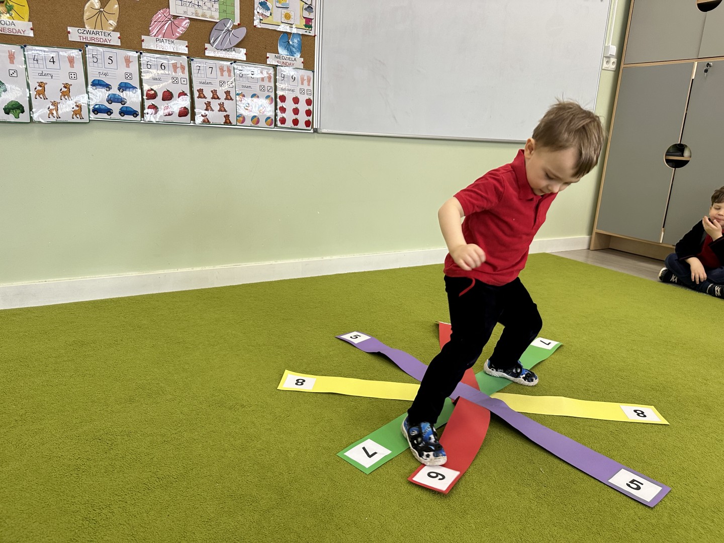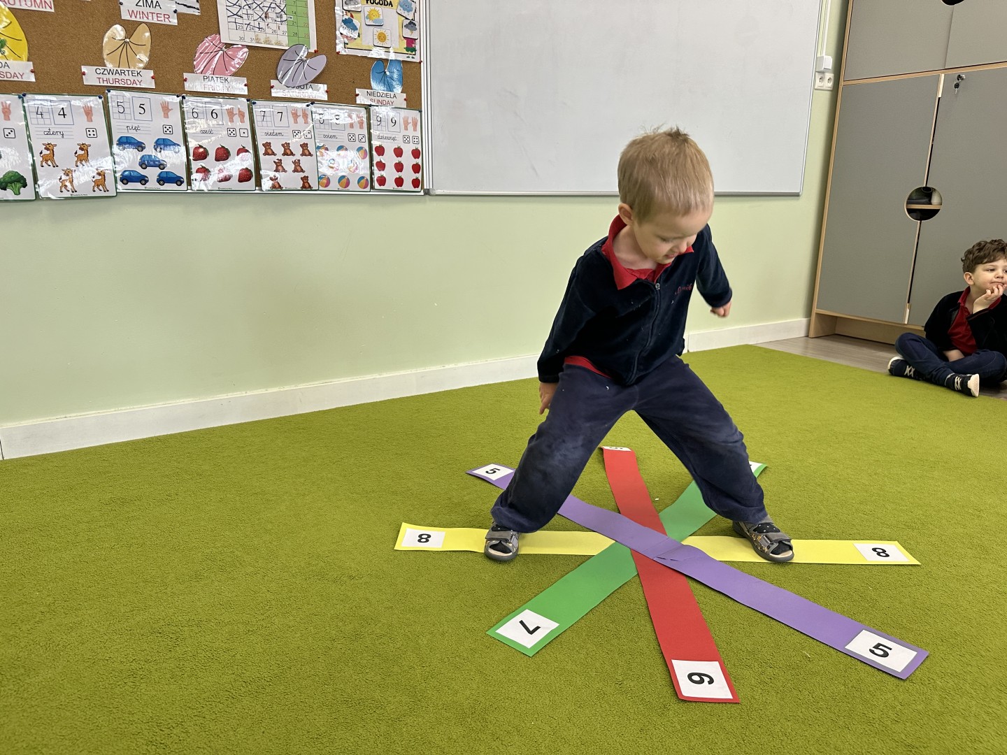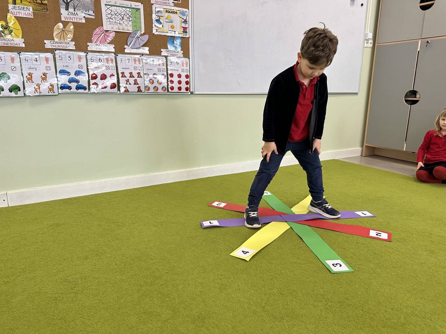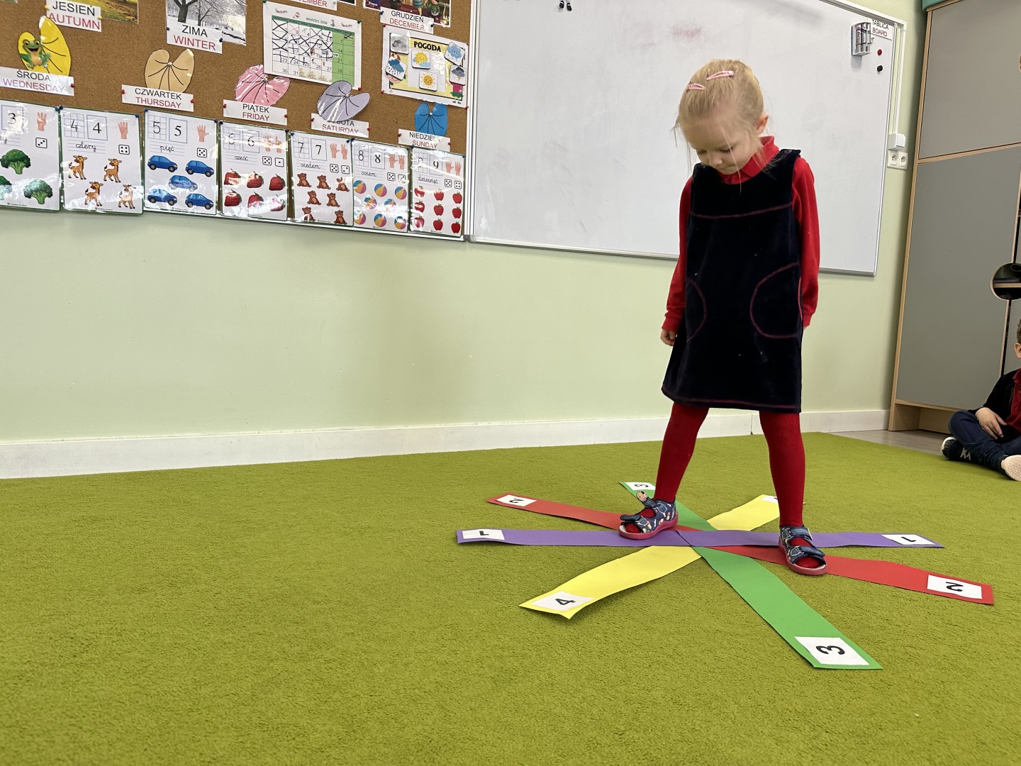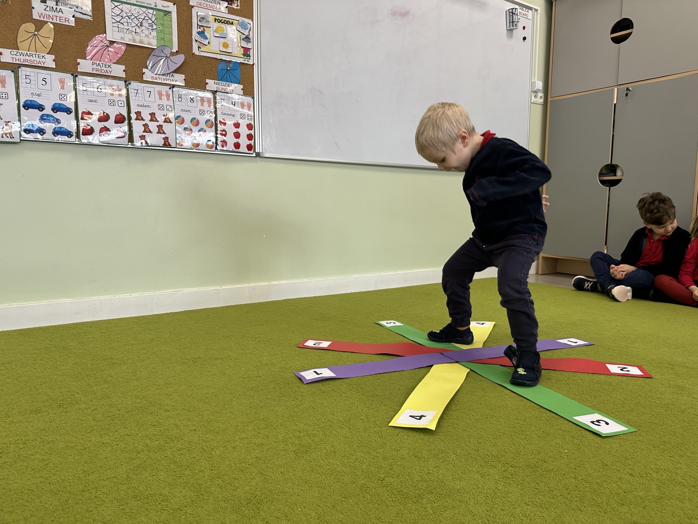 W trakcie zajęć nie zabrakło również aktywności ruchowych – dzieci brały udział w zabawie, w której nauczyciel podawał cyfrę, a ich zadaniem było odszukanie jej i skoczenie na właściwe pole.