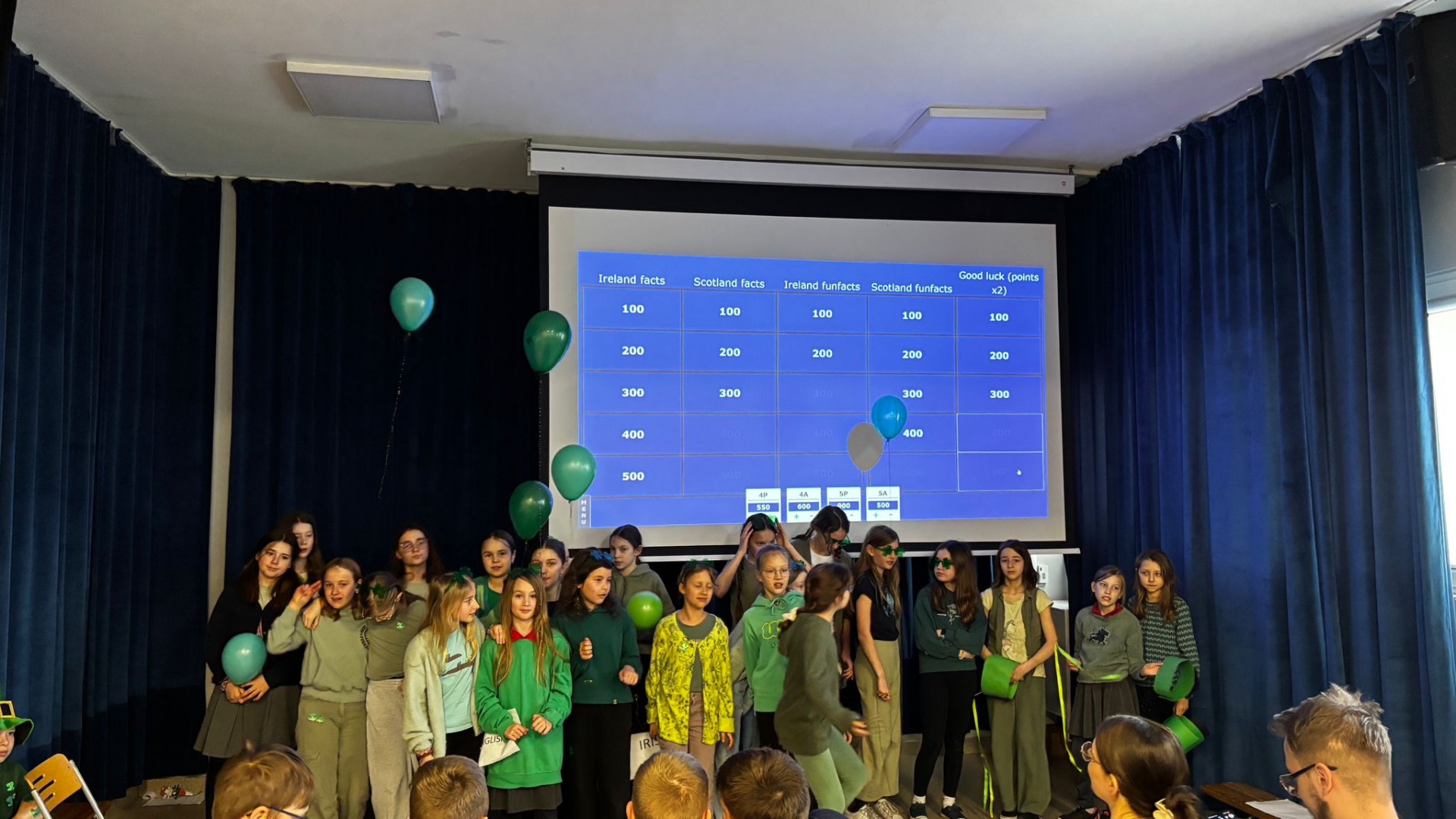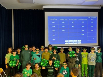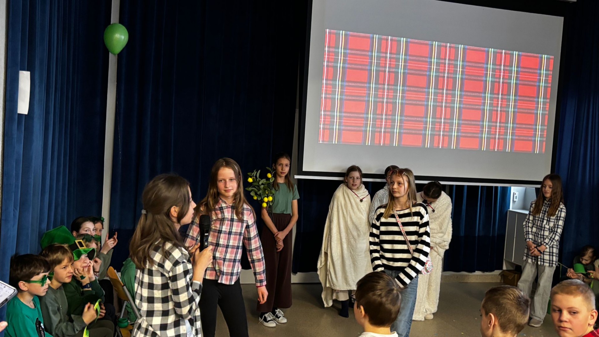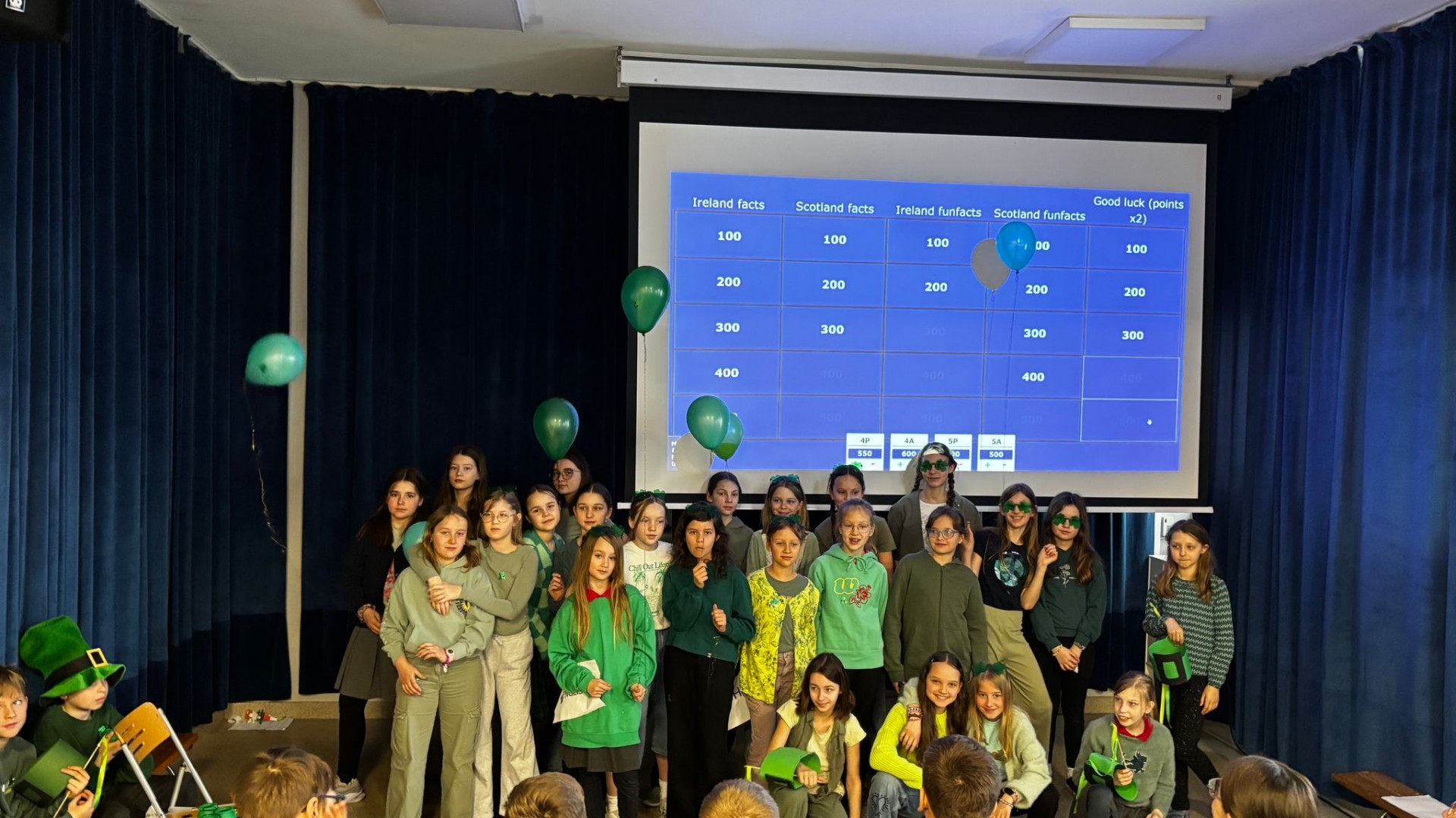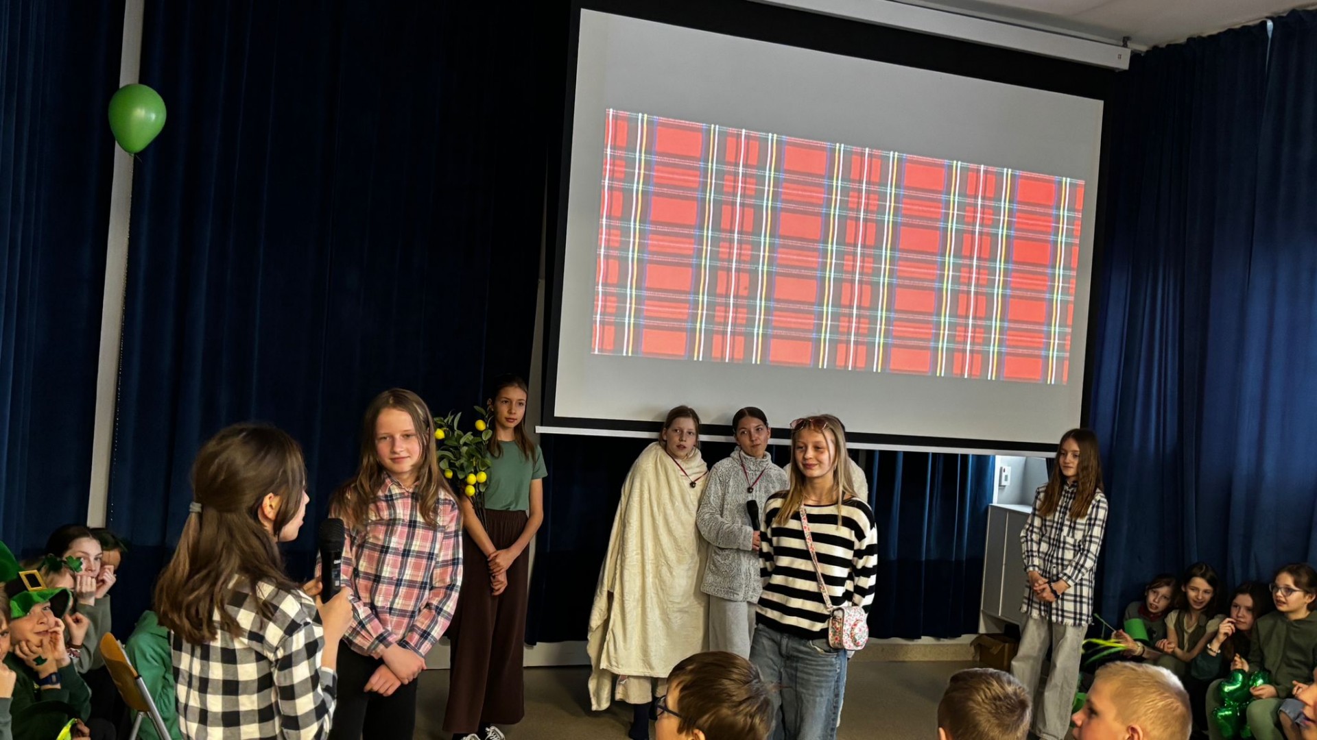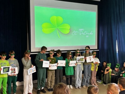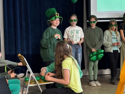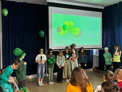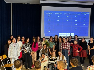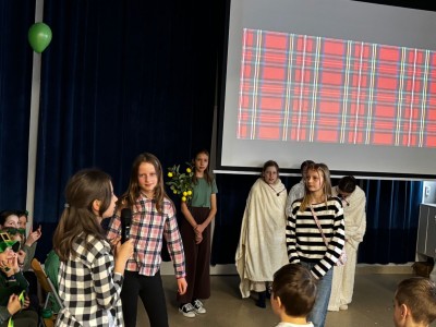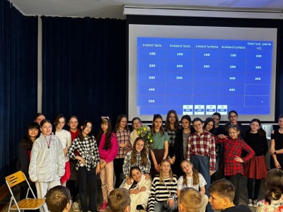 Najpierw zaprezentowały się klasy 4 i 5. Irlandzka zieleń i leprechauny zmierzyły się ze szkocką kratą i dudami. Było kolorowo, wesoło i głośno od charakterystycznych nut muzyki irlandzkiej i szkockiej. Po prezentacjach każda z klas wyłoniła po 2 śmiałków, którzy zmierzyli się w teście wiedzy o Irlandii i Szkocji. Emocje sięgały zenitu, a quiz ostatecznie wygrała klasa 5P.