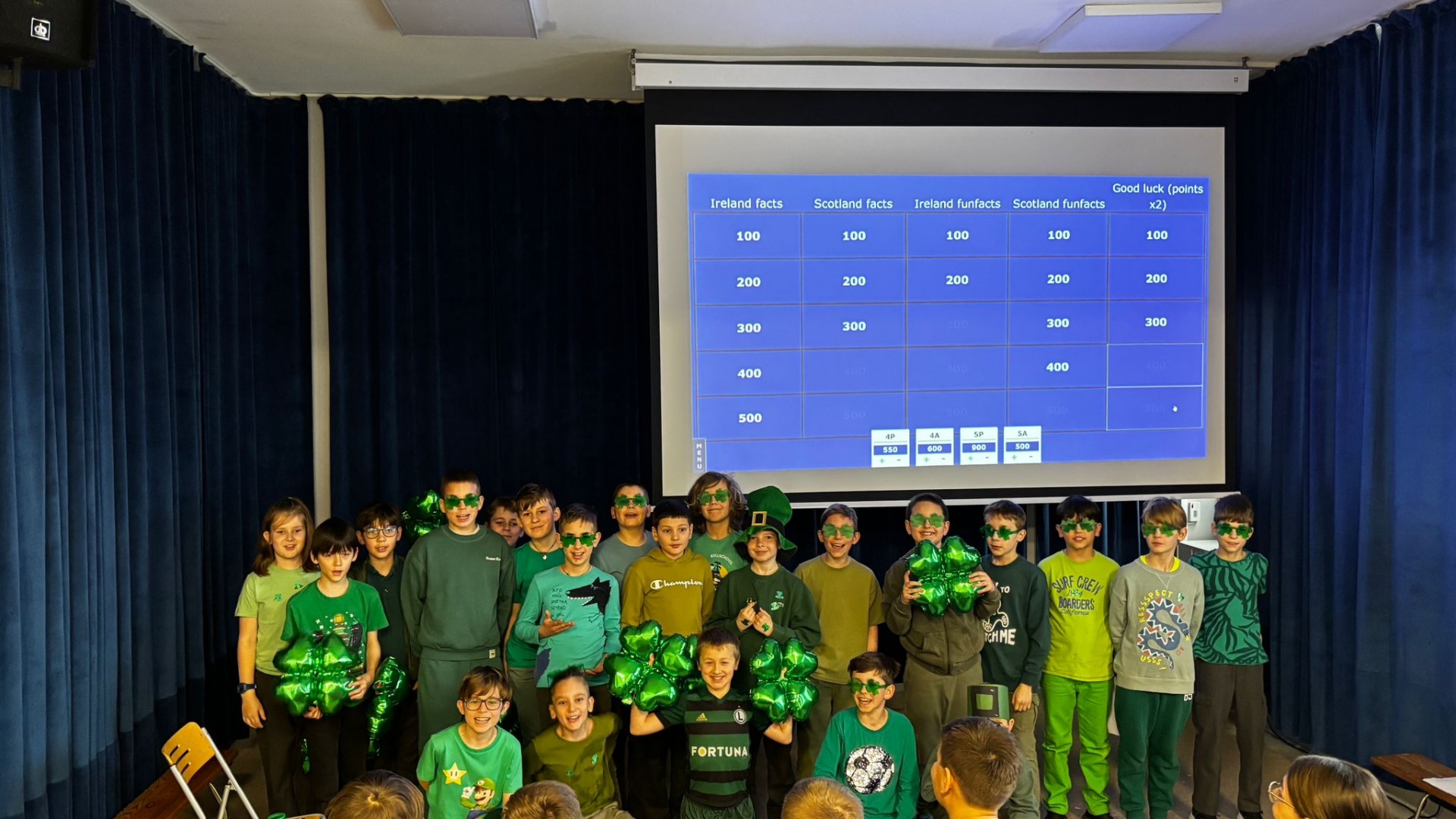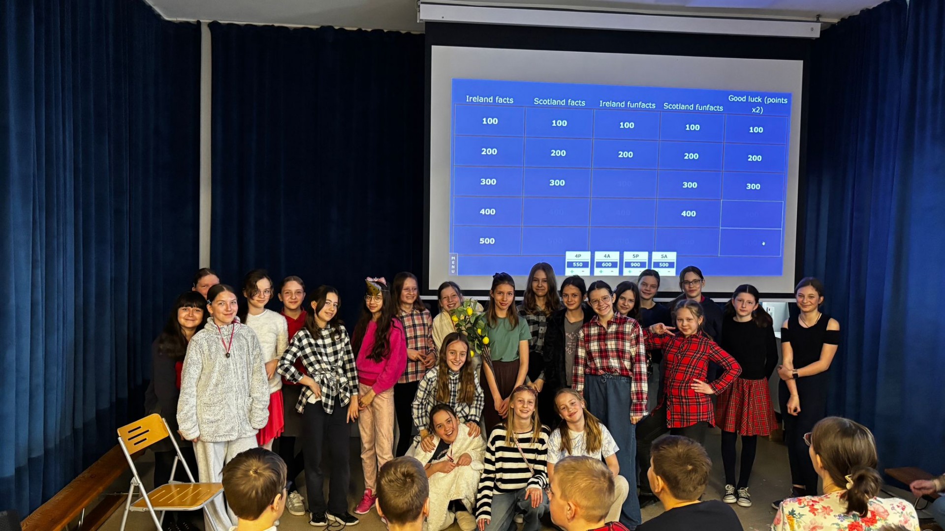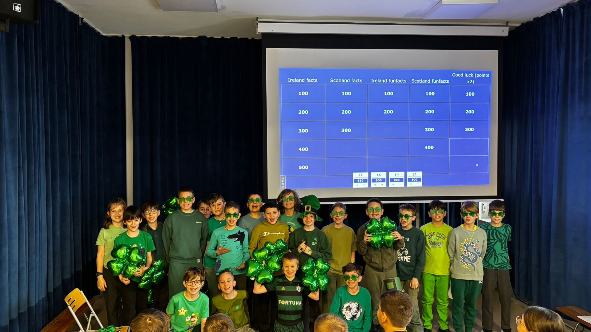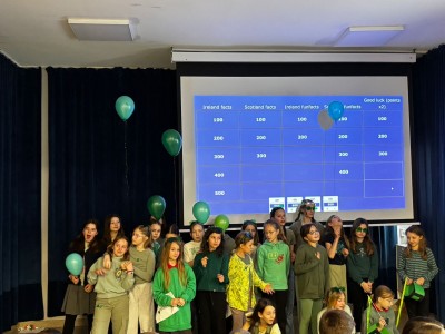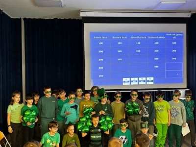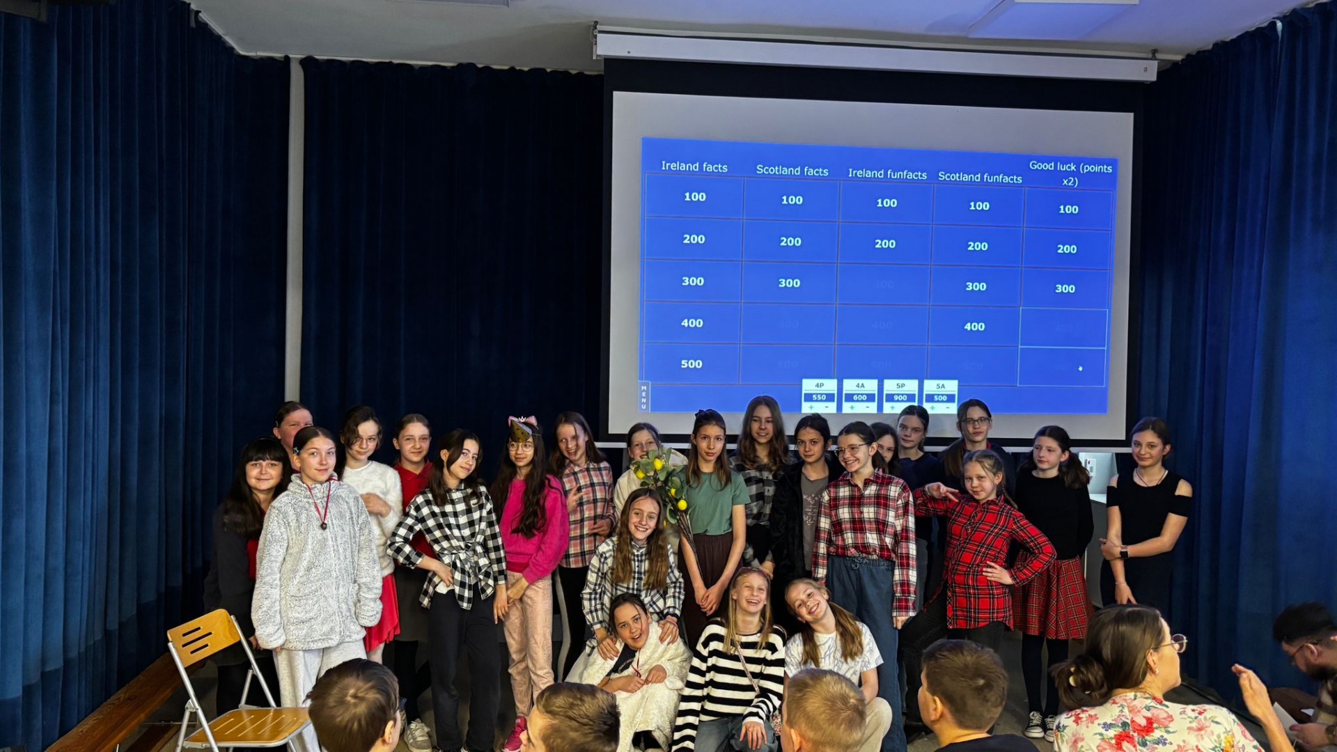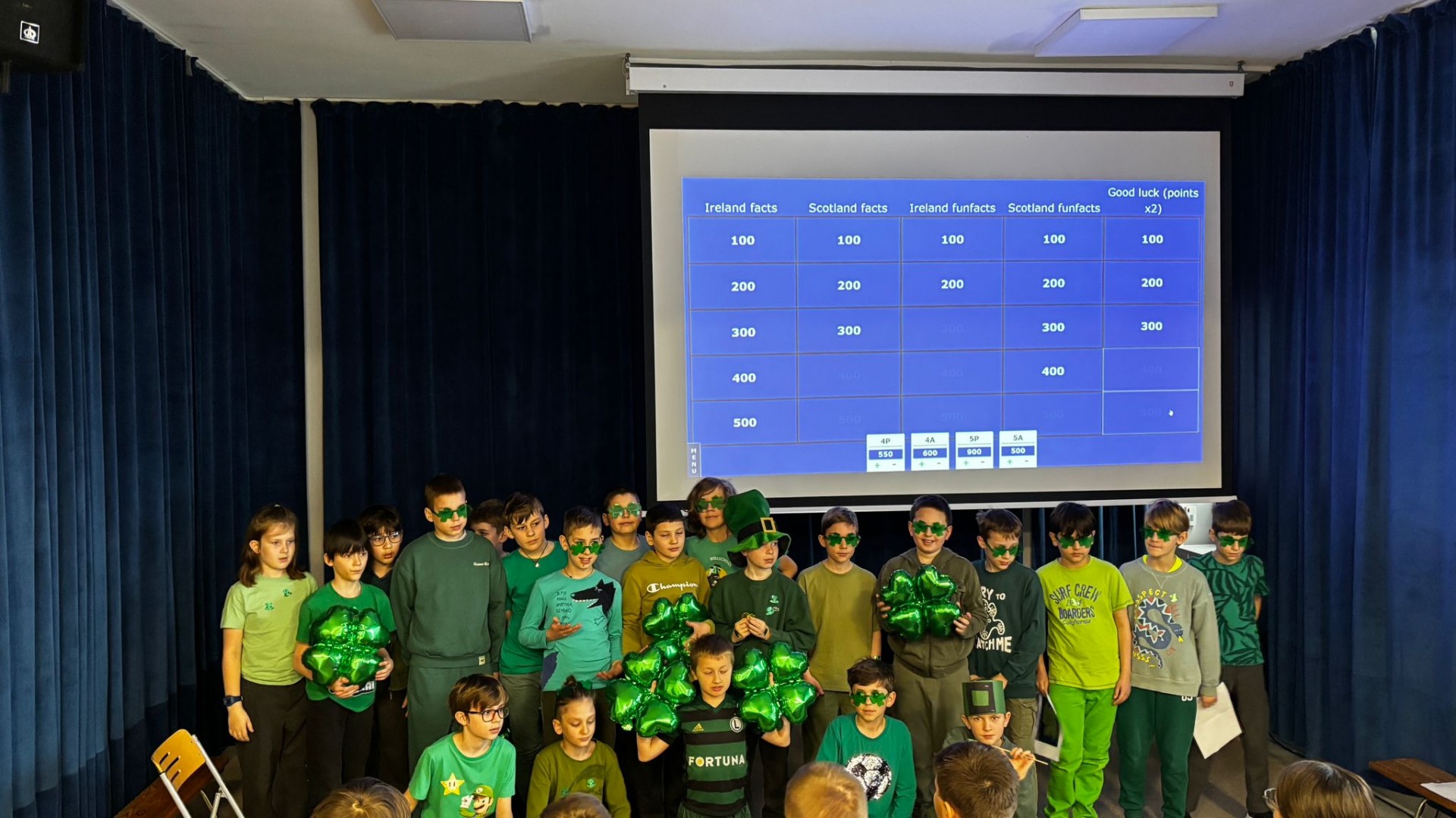 Najpierw zaprezentowały się klasy 4 i 5. Irlandzka zieleń i leprechauny zmierzyły się ze szkocką kratą i dudami. Było kolorowo, wesoło i głośno od charakterystycznych nut muzyki irlandzkiej i szkockiej. Po prezentacjach każda z klas wyłoniła po 2 śmiałków, którzy zmierzyli się w teście wiedzy o Irlandii i Szkocji. Emocje sięgały zenitu, a quiz ostatecznie wygrała klasa 5P.