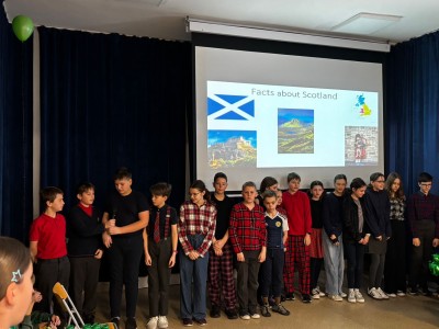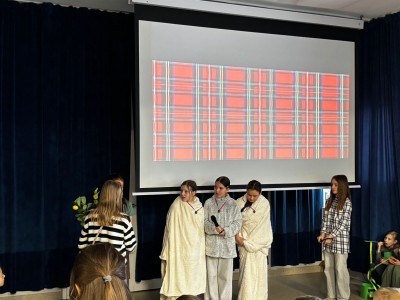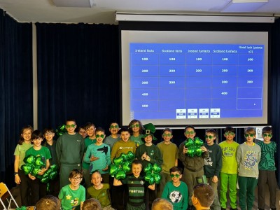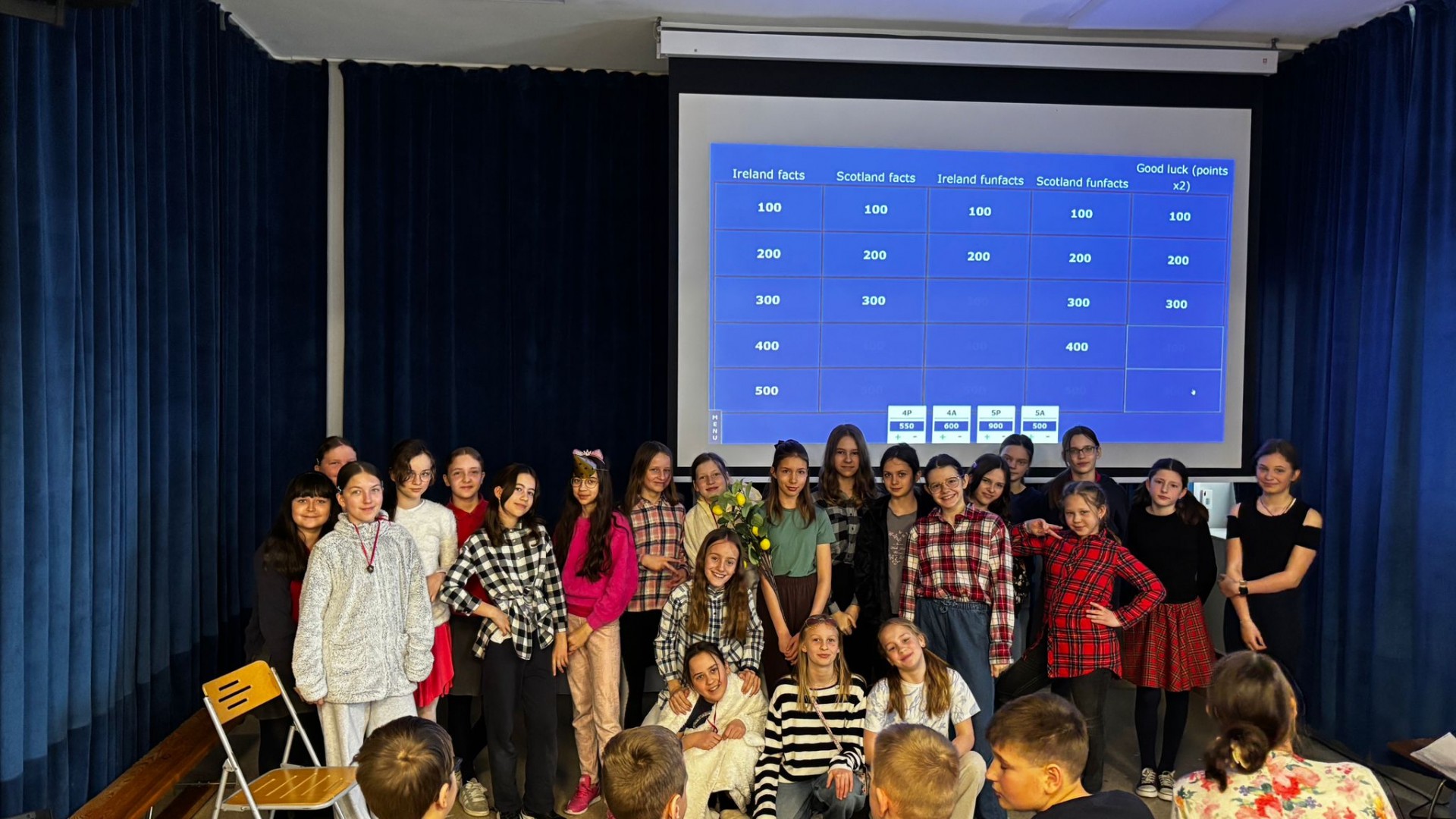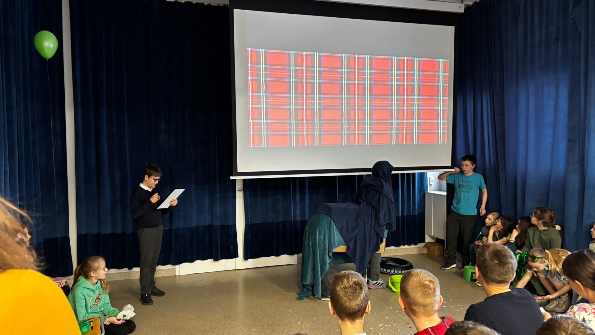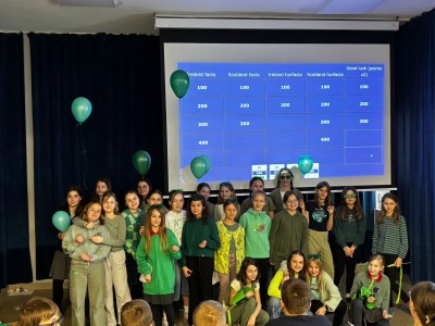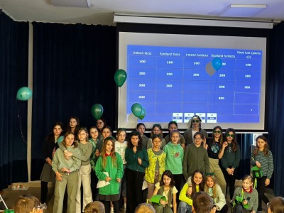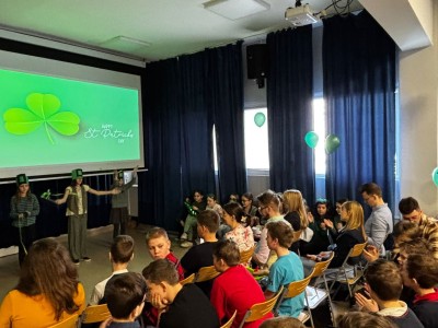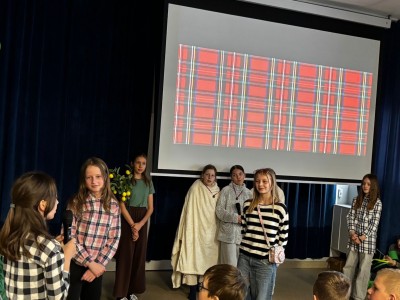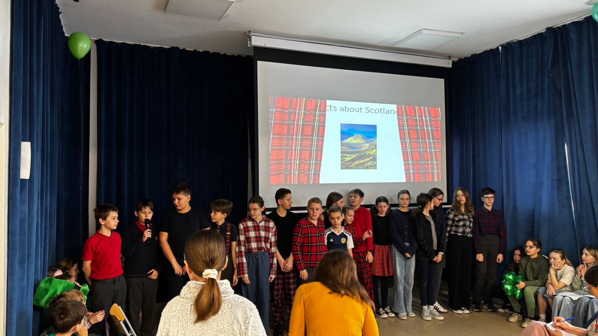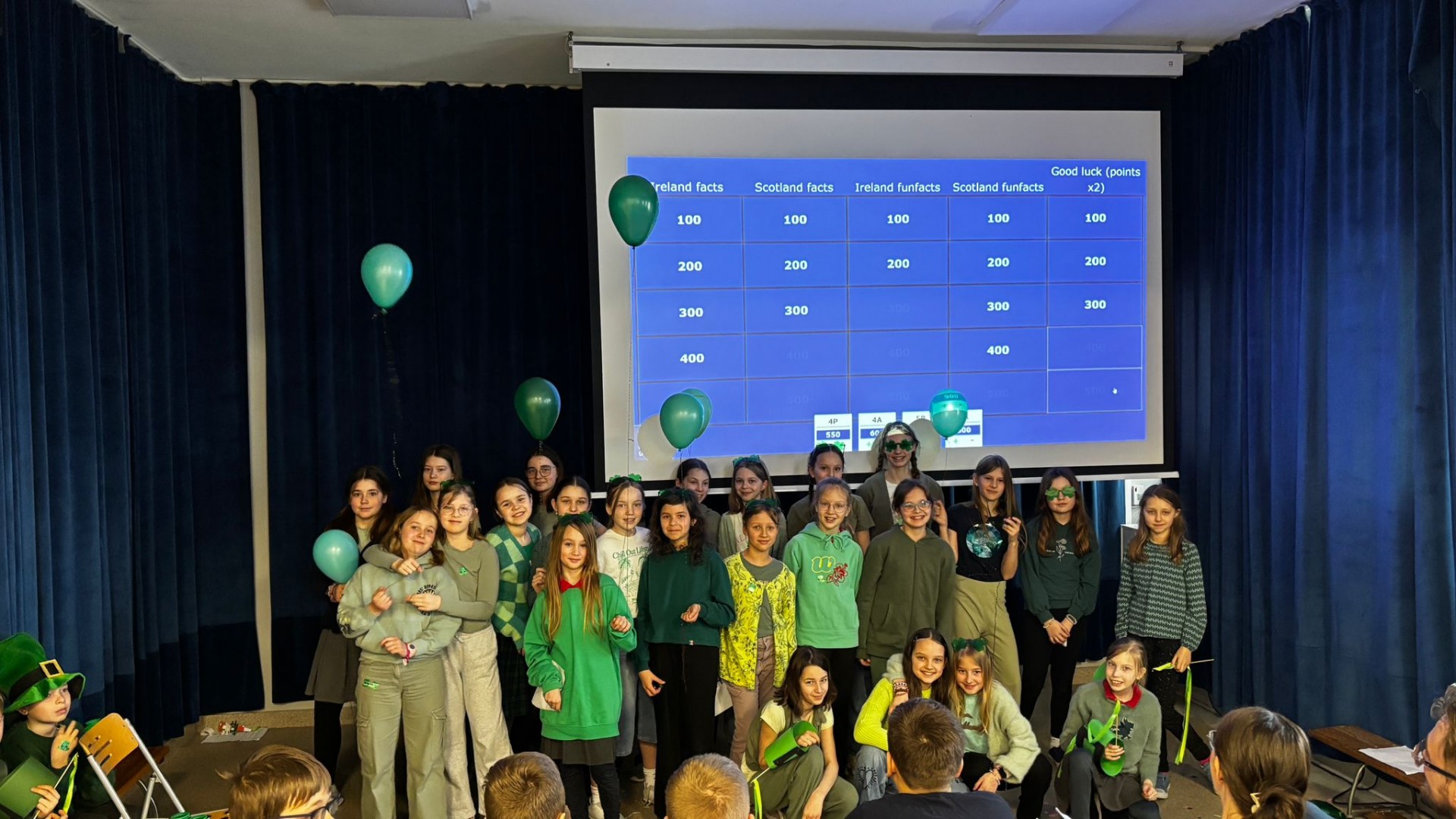 Najpierw zaprezentowały się klasy 4 i 5. Irlandzka zieleń i leprechauny zmierzyły się ze szkocką kratą i dudami. Było kolorowo, wesoło i głośno od charakterystycznych nut muzyki irlandzkiej i szkockiej. Po prezentacjach każda z klas wyłoniła po 2 śmiałków, którzy zmierzyli się w teście wiedzy o Irlandii i Szkocji. Emocje sięgały zenitu, a quiz ostatecznie wygrała klasa 5P.
