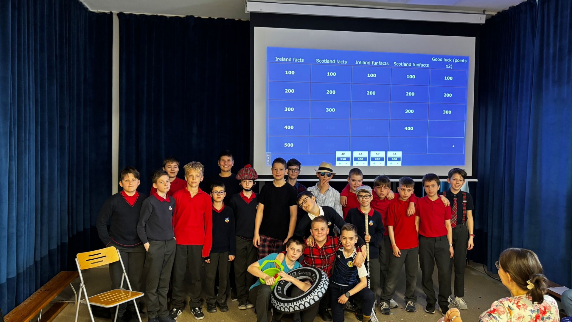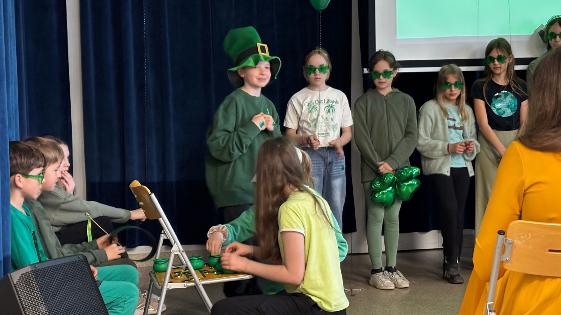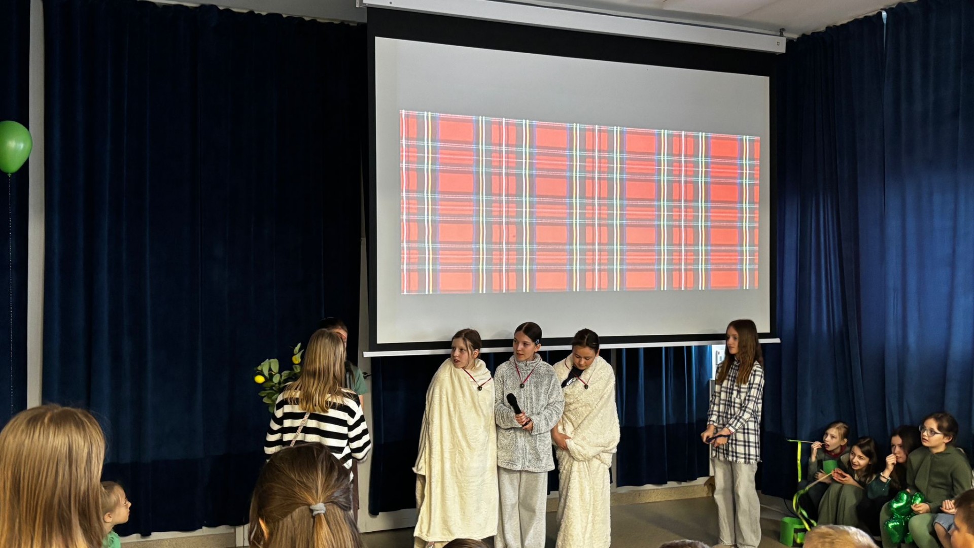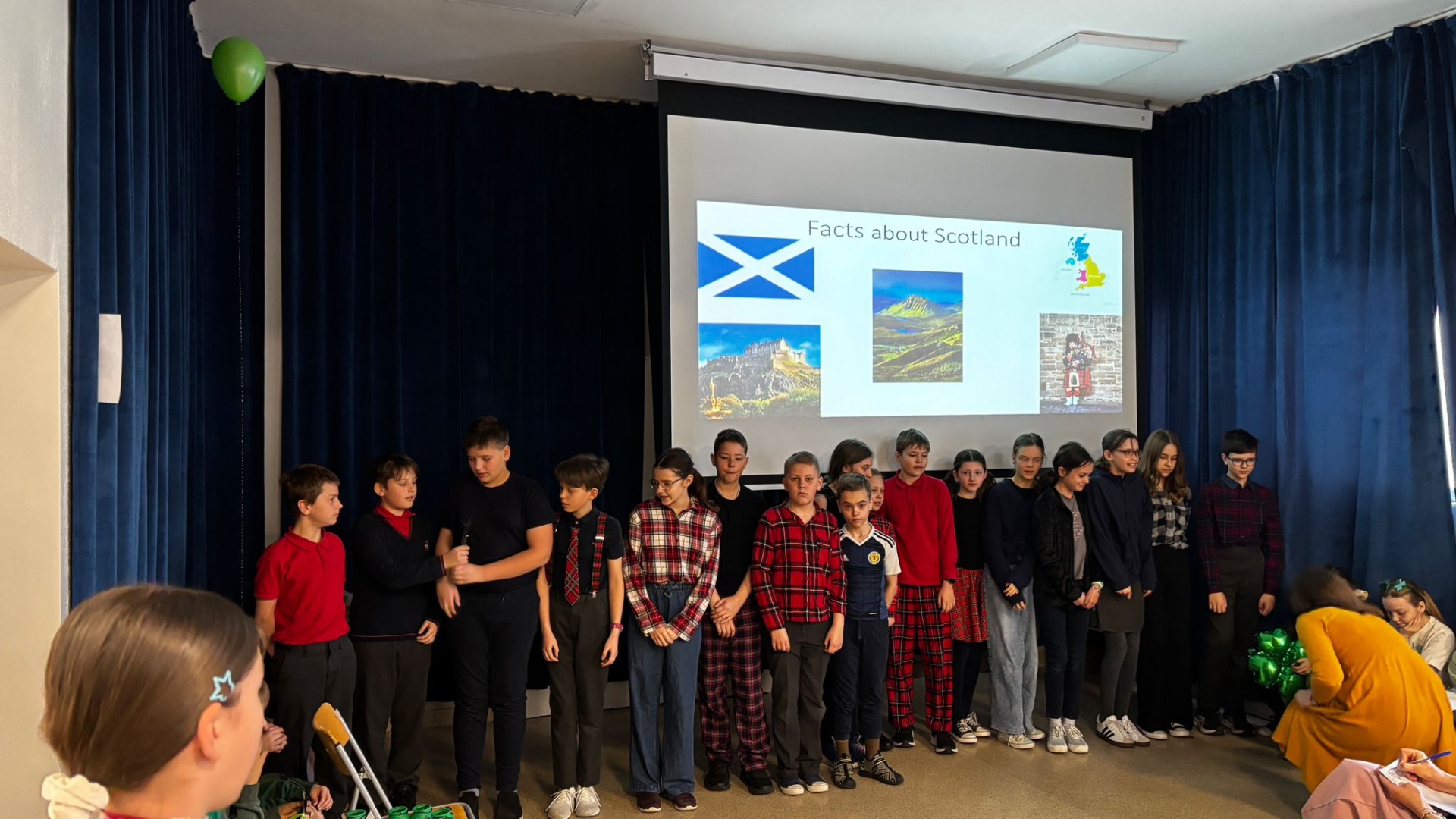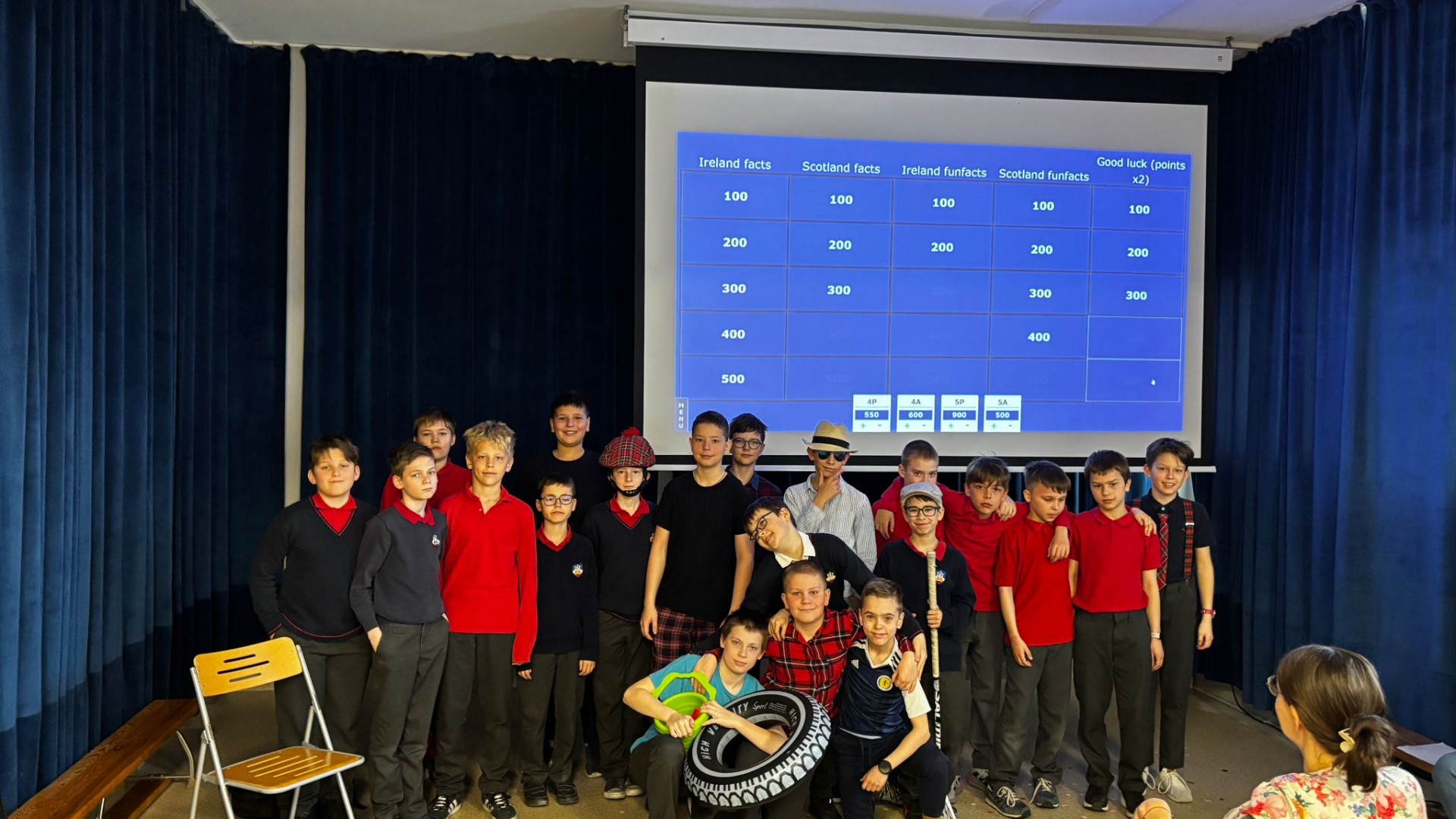 Najpierw zaprezentowały się klasy 4 i 5. Irlandzka zieleń i leprechauny zmierzyły się ze szkocką kratą i dudami. Było kolorowo, wesoło i głośno od charakterystycznych nut muzyki irlandzkiej i szkockiej. Po prezentacjach każda z klas wyłoniła po 2 śmiałków, którzy zmierzyli się w teście wiedzy o Irlandii i Szkocji. Emocje sięgały zenitu, a quiz ostatecznie wygrała klasa 5P.