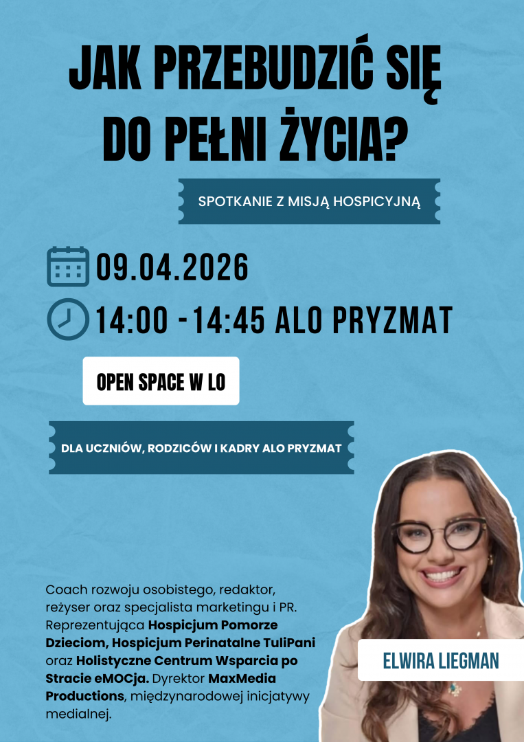 Serdecznie zapraszamy uczniów kl. 1-3 oraz chętnych rodziców na spotkanie z p. Elwirą Liegman, współzałożycielką pierwszego w Polsce Holistycznego Centrum Wsparcia po Stracie eMOCja oraz Hospicjum Pomorze Dzieciom. Spotkanie odbędzie się 9 kwietnia w godz. 14:00 - 14:45 w nowym korytarzu licealnym (Open Space).