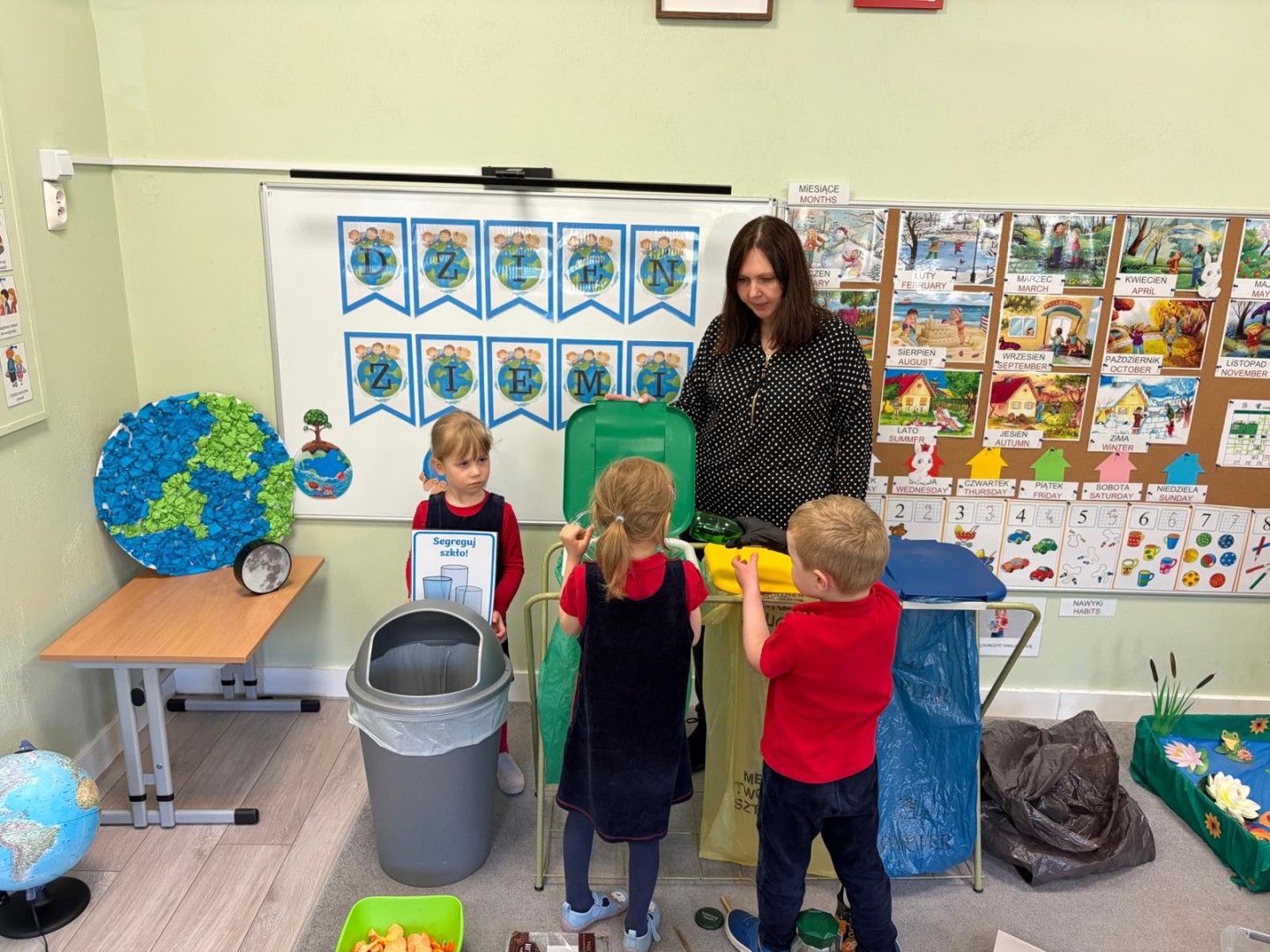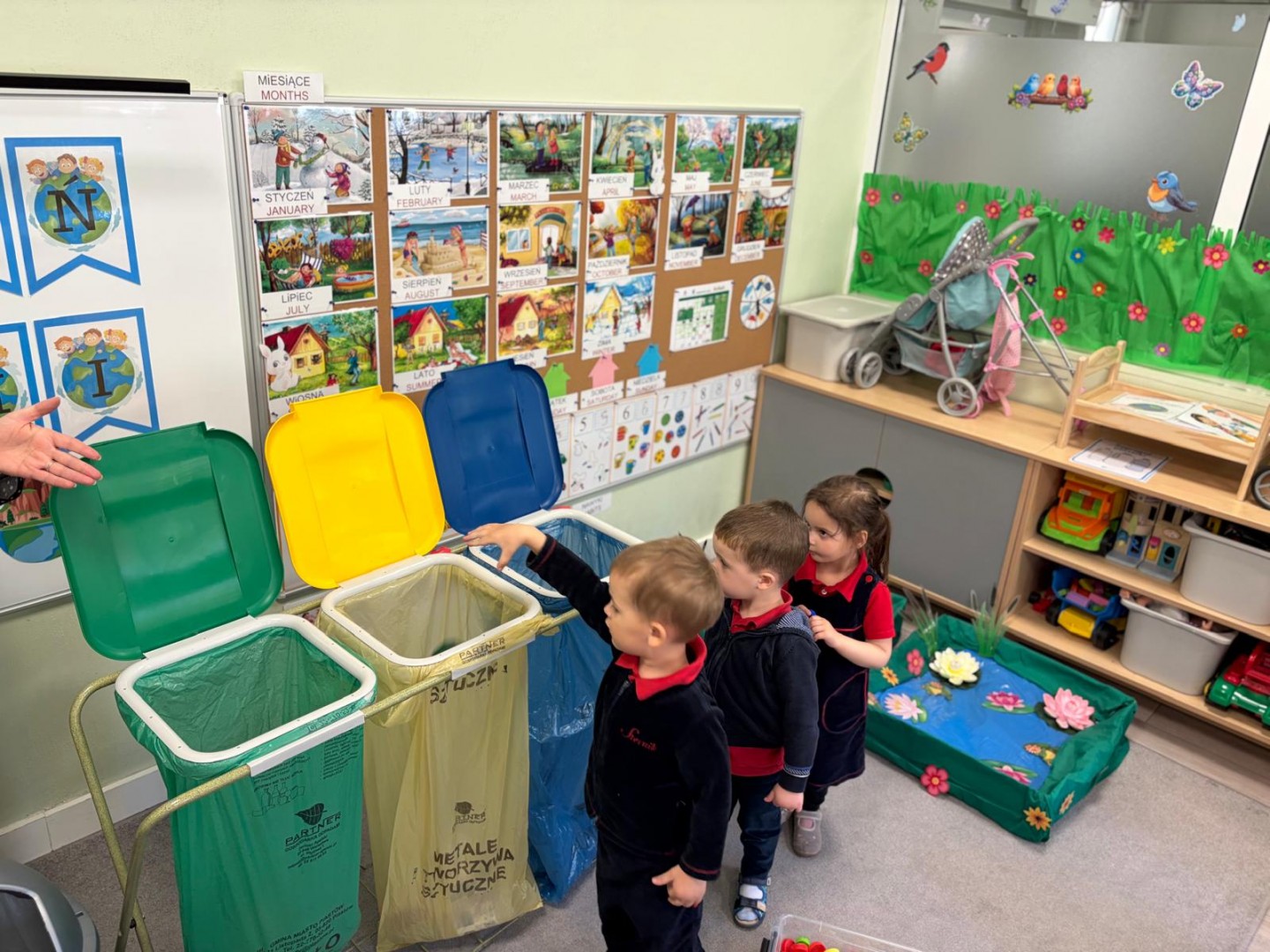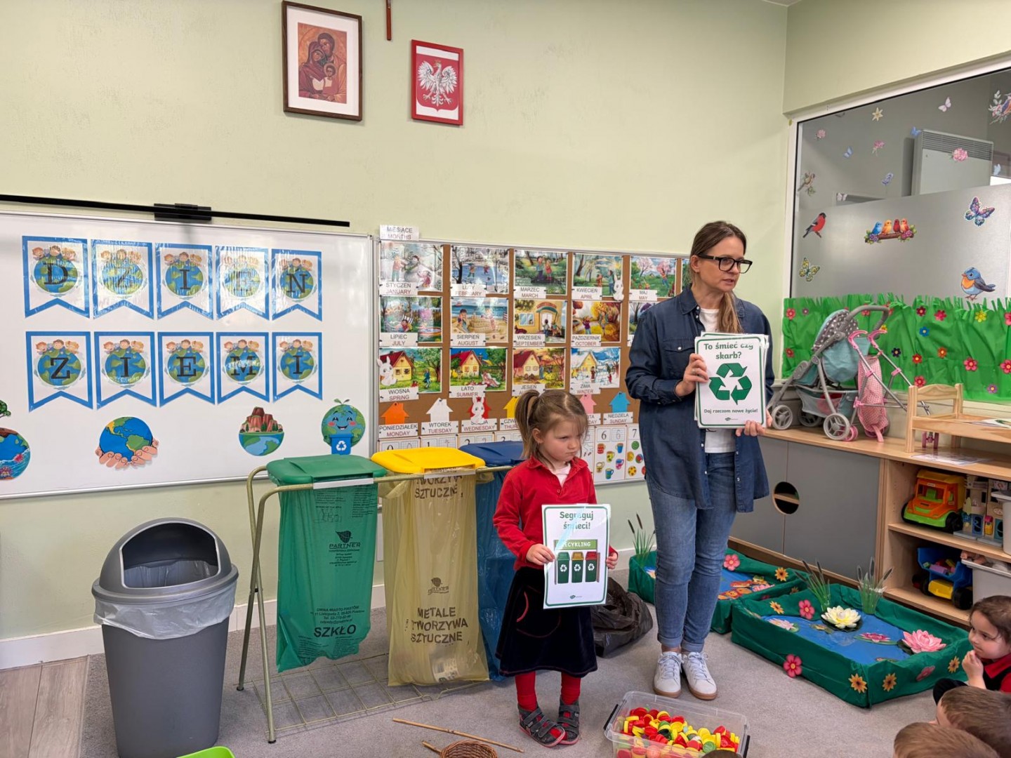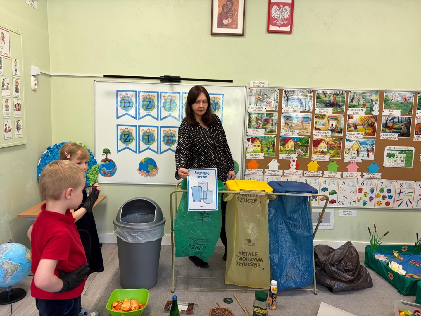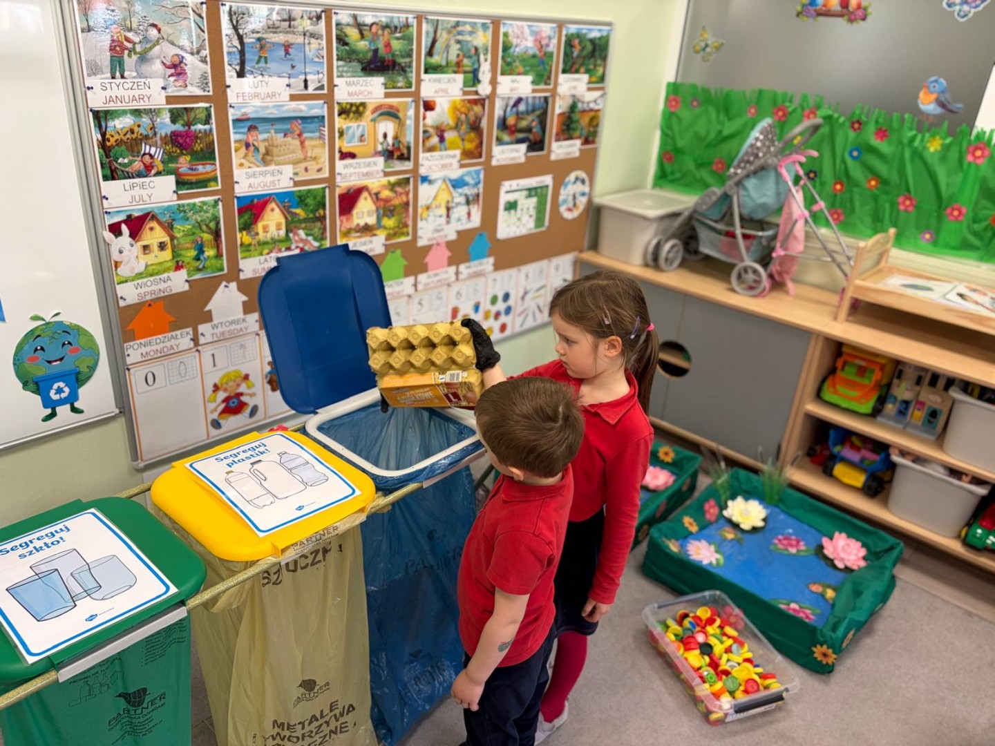 Podczas zajęć rozmawialiśmy o tym, jak dbać o środowisko. Dzieci wiedzą już, jak ważna jest segregacja śmieci oraz recykling. W sali zostały przygotowane specjalne worki na śmieci, a przedszkolaki z dużym zaangażowaniem segregowały odpady, wrzucając je do odpowiednich worków.