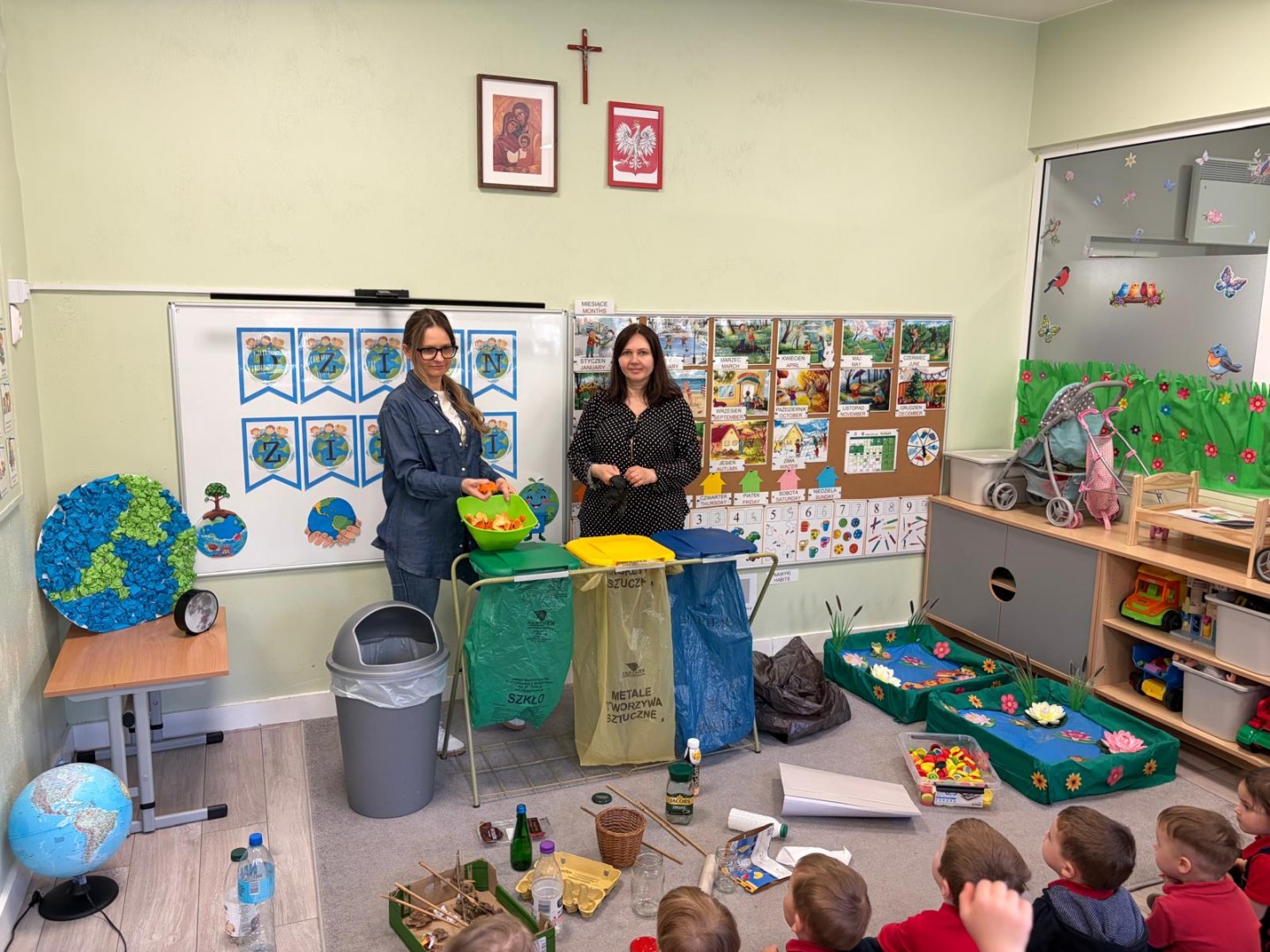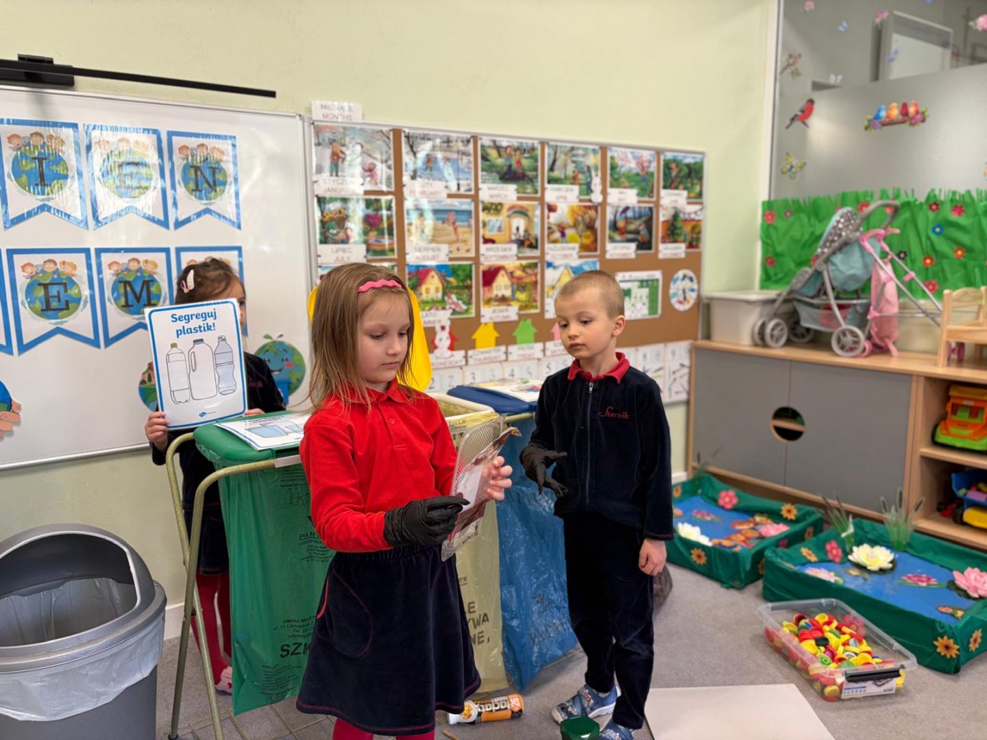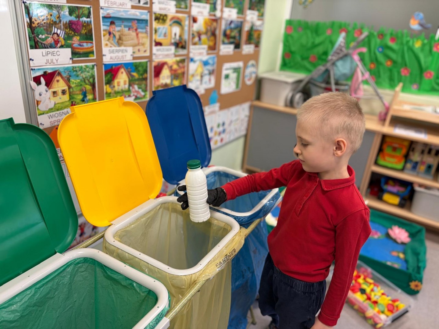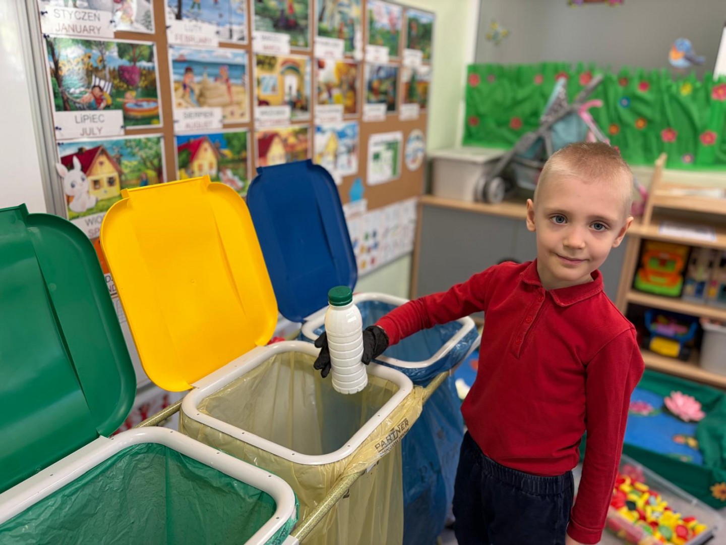 Podczas zajęć rozmawialiśmy o tym, jak dbać o środowisko. Dzieci wiedzą już, jak ważna jest segregacja śmieci oraz recykling. W sali zostały przygotowane specjalne worki na śmieci, a przedszkolaki z dużym zaangażowaniem segregowały odpady, wrzucając je do odpowiednich worków.
