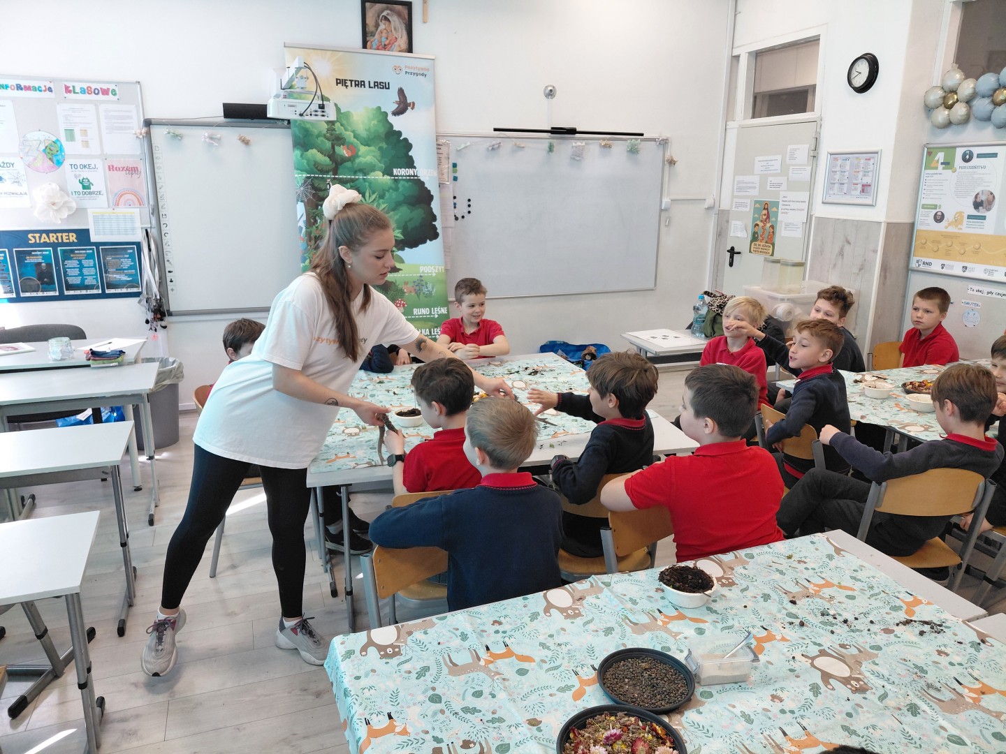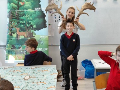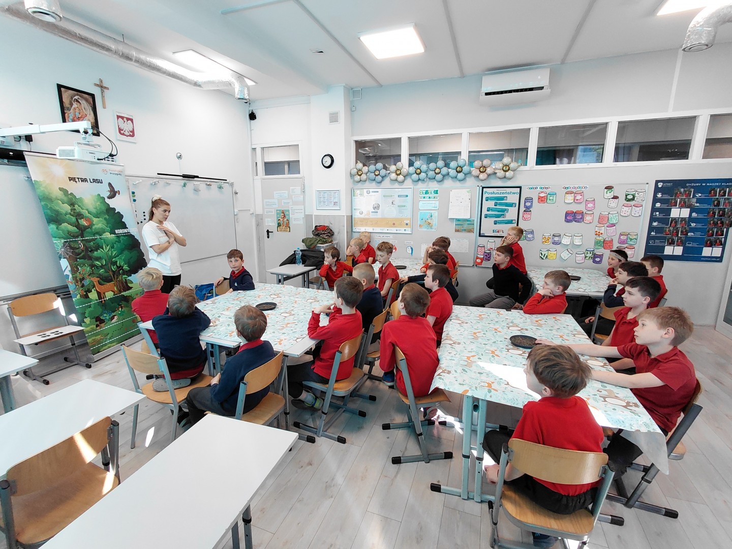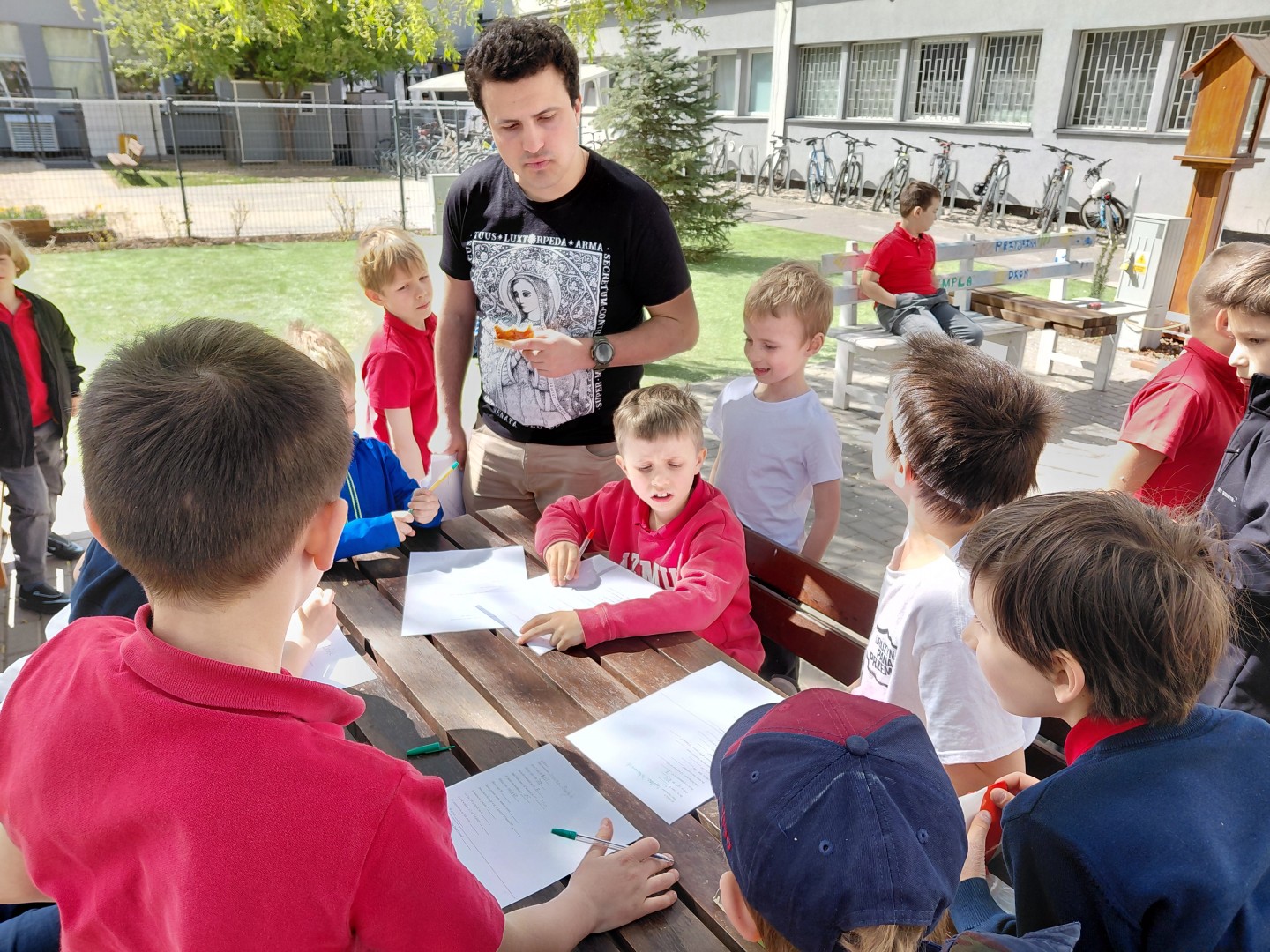 Zapach pizzy, odgłosy lasu oraz okrzyki rywalizacji sportowej dominowały w chłopięcych klasach 0-3. Na warsztatach "Leśne opowieści" uczniowie rozpoznawali tropy oraz poroża dzikich zwierząt, poznawali piętra lasu oraz sadzili roślinki, o które teraz warto zadbać i pielęgnować wykazując się cnotą odpowiedzialności.