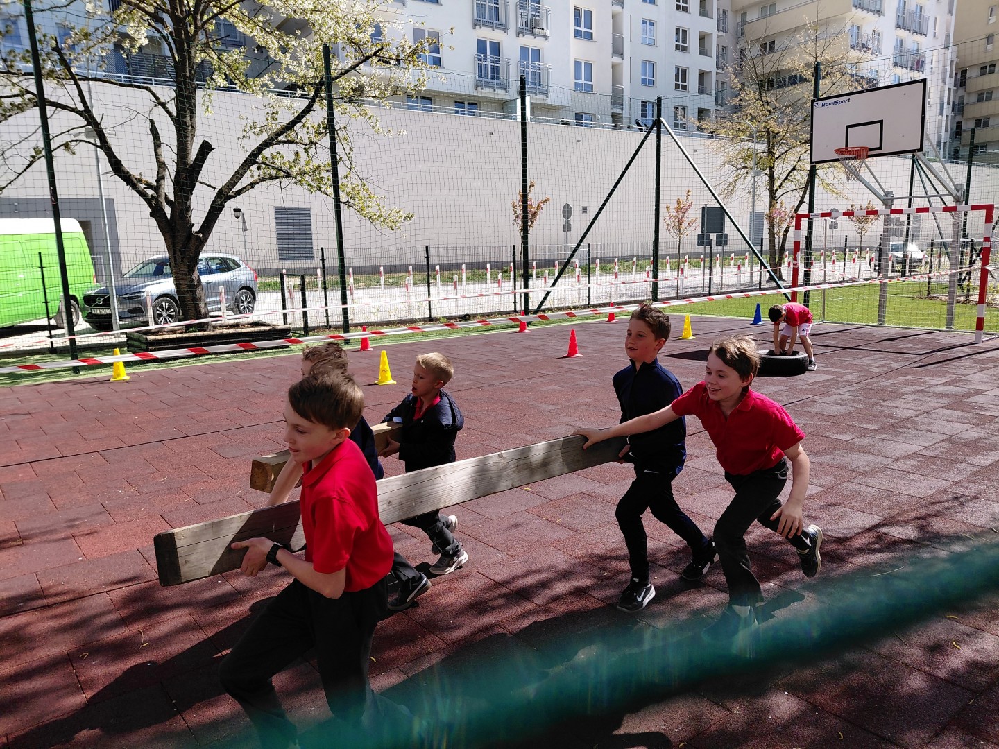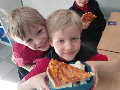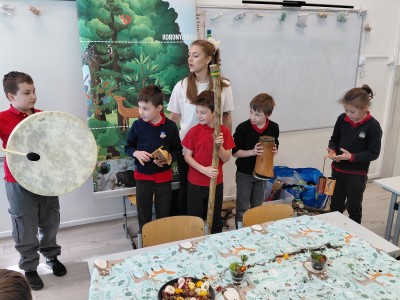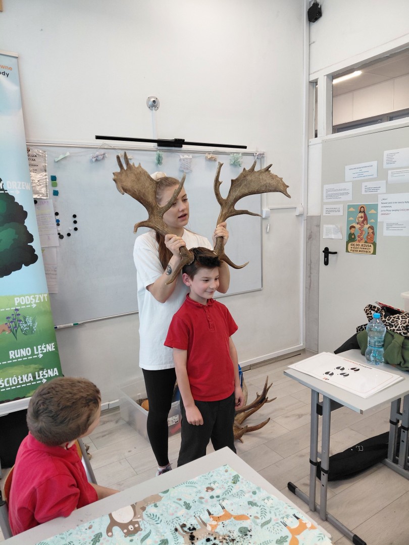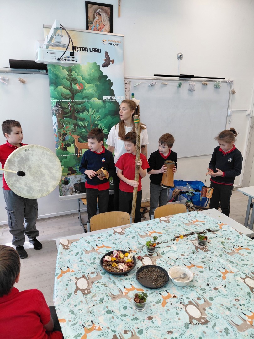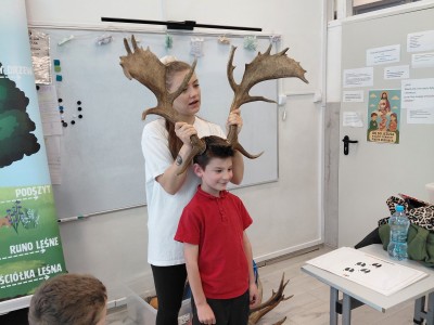 Zapach pizzy, odgłosy lasu oraz okrzyki rywalizacji sportowej dominowały w chłopięcych klasach 0-3. Na warsztatach "Leśne opowieści" uczniowie rozpoznawali tropy oraz poroża dzikich zwierząt, poznawali piętra lasu oraz sadzili roślinki, o które teraz warto zadbać i pielęgnować wykazując się cnotą odpowiedzialności.